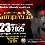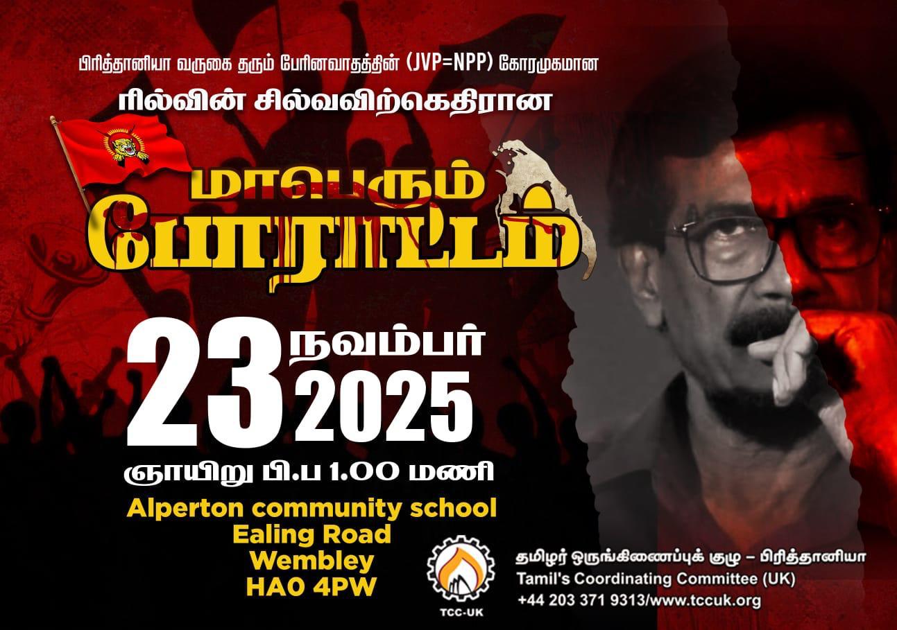 போராட்டத்திற்கான அவசர அழைப்பு! எங்கள் தாயகத்திற்காக உயிர் தந்த மாவீரர்களின் காலமதில் இனவழிப்பாளர்களின் பிரித்தானிய வருகையை கண்டித்து மாபெரும் போராட்டத்திற்கு அழைப்பு விடுக்கின்றோம்! புத்தபகவானின் பெயரால் சிங்கள பெளத்த பேரின வாதிகளால் ஆக்கிரமிக்கப்படும் தமிழர் தாயகத் தலைநகரமான திருகோணமலை! பிரித்தானியா வருகை தரும் பேரினவாதத்தின் (JVP=NPP) கோரமுகமான ரில்வின் சில்வாவிற்கெதிரான போராட்டத்தில் இணைந்து கொள்வோம். தமிழ்த் தேசியத் தளத்தில் இயங்கும் அனைவருமாக எமது மக்களைஇணைத்து போராட்டத்தை பலப்படுத்துவோம். காலமும் முகவரியும் 23.11. 2025ஞாயிறு பி.ப1:00மணி Alperton community school Ealing Road Wembley HA0 4PW