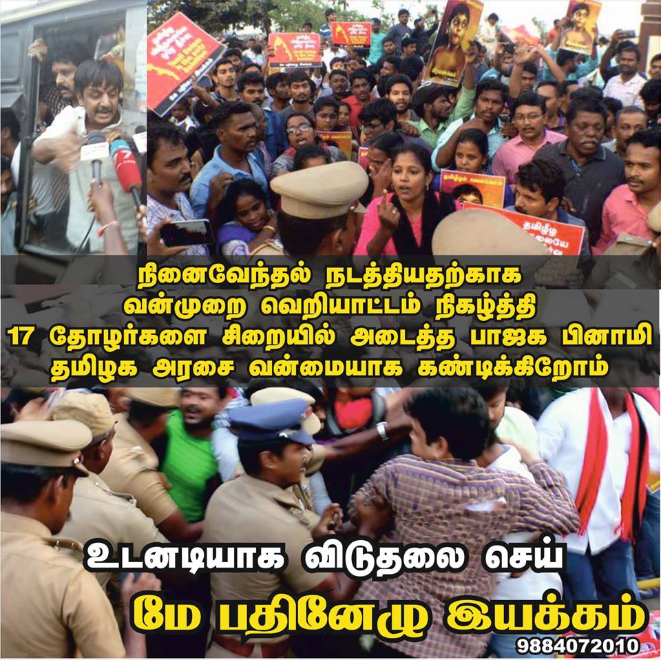 சிங்கள அரசின் முழு ஏஜெண்டாக செயல்படும் பாஜக-ஆர்.எஸ்.எஸ்-ன் அடியாளாக மாறியிருக்கும் எடப்பாடி பழனிசாமி அரசின் இந்த தமிழர் விரோதப் போக்கினை அனைவரும் கண்டிக்க முன்வாருங்கள். பாஜக-ஆர்.எஸ்.எஸ்-அதிமுக கூட்டணிக்கு எதிராக ஜனநாயக ஆற்றல்களை ஒன்றுதிரட்டி தமிழர் விரோத சக்திகளை விரட்டும் வேலையை மே பதினேழு இயக்கம் செய்து முடிக்கும்.
