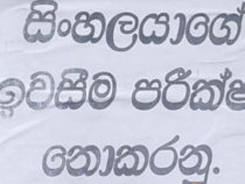 சிங்களயாகே இவசீம பரீக்ஸா நொகரனு’ என்ற வாக்கியங்கள் கணணி மூலம்சிங்கள மொழியிலான அச்சுப்பிரதிகளே சுவரொட்டி ஒட்டப்பட்டிருந்தன.