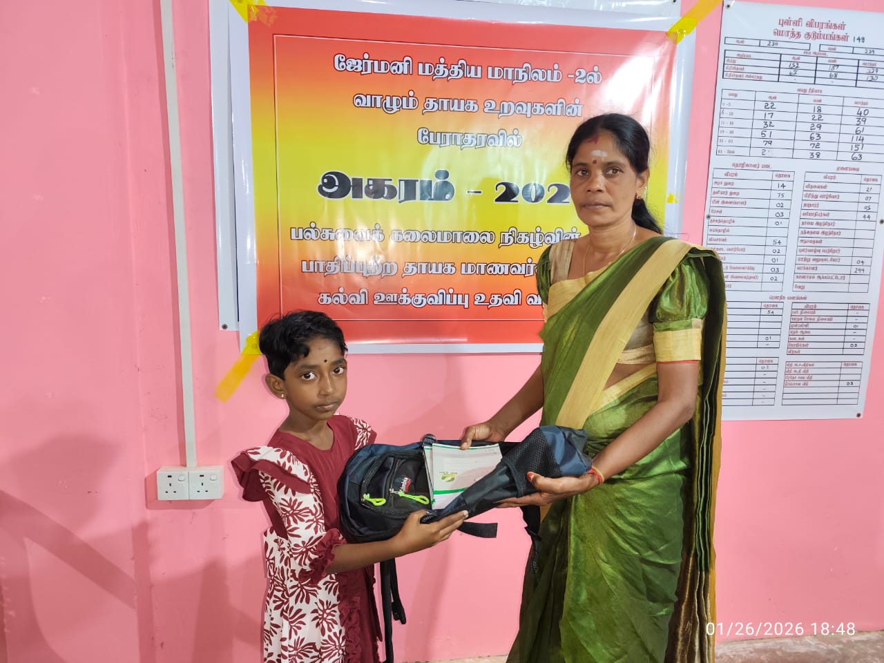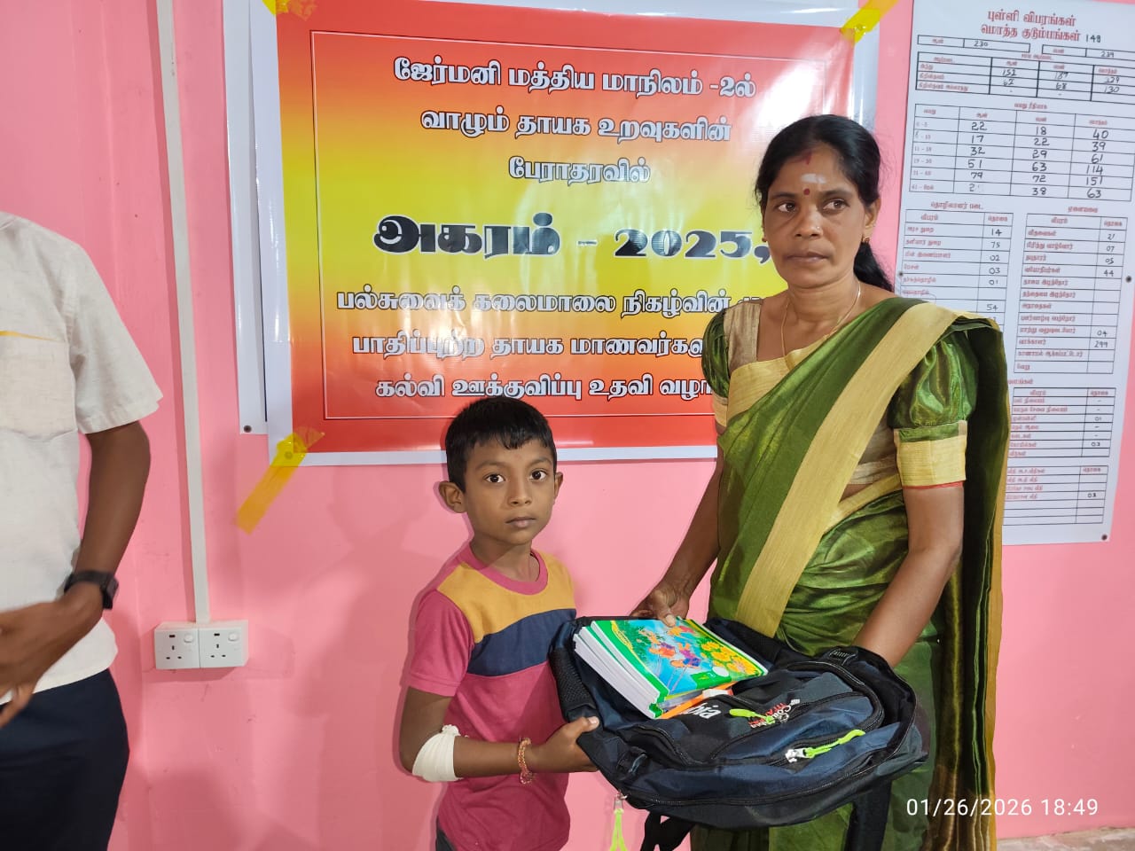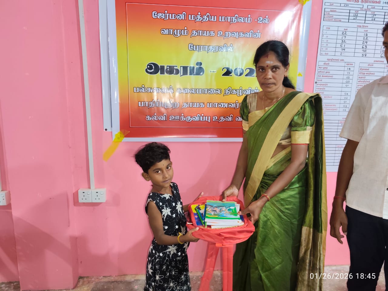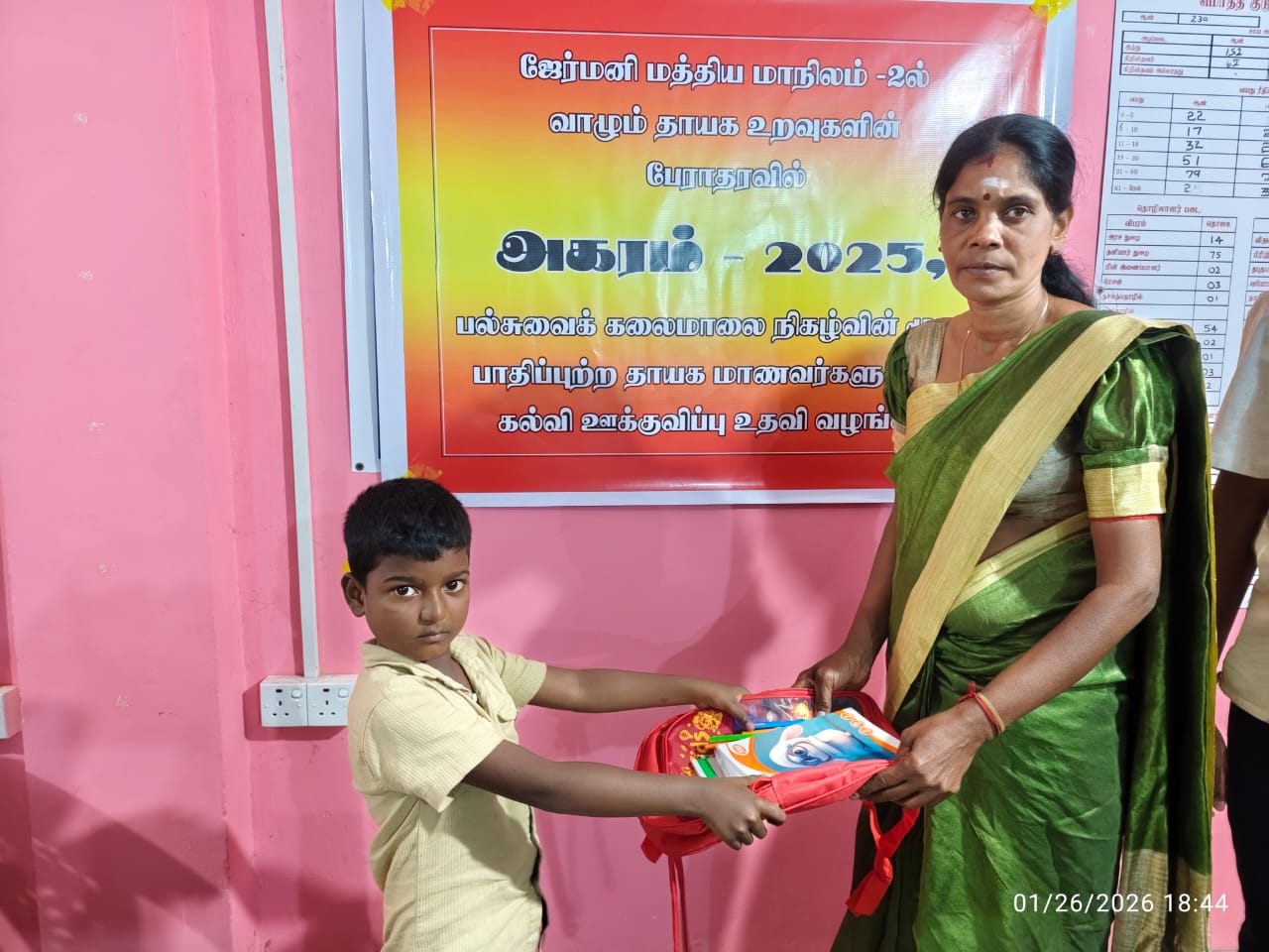 26/01/2026. முல்லைத்தீவு மாவட்டத்தின் மல்லாவி பிரதேசத்திற்குட்பட்ட அனிஞ்சியன்குளம், மற்றும் துணுக்காய் பிரதேசத்திற்குட்பட்ட அமைதிபுரம், ஆரோக்கியபுரம்ஆகிய கிராமங்களைச் சேர்ந்த மாணவர்களில் கடந்த மாதங்களில் ஏற்பட்ட வெள்ள அனர்த்தத்தால் மழை வெள்ளம் வீடுகளுக்குள் புகுந்து வீட்டு தளபாடங்கள் பாடசாலை உபகரணங்கள் அனைத்தும் பாதிக்கப்பட்ட நிலையில் உள்ள வறுமைக்குட் பட்ட 50 மாணவர்களுக்கு ஜேர்மன் மத்திய மாநிலம்-2ல் வாழும் தாயக உறவுகளின் பேராதரவில் அகரம்-2025 “பல்சுவை கலைமாலை”நிகழ்வின் மூலம் பாதிப்புற்ற தாயக மாணவர்களுக்கான கல்வி ஊக்குவிப்பு செயற்திட்டத்தின் கீழ்