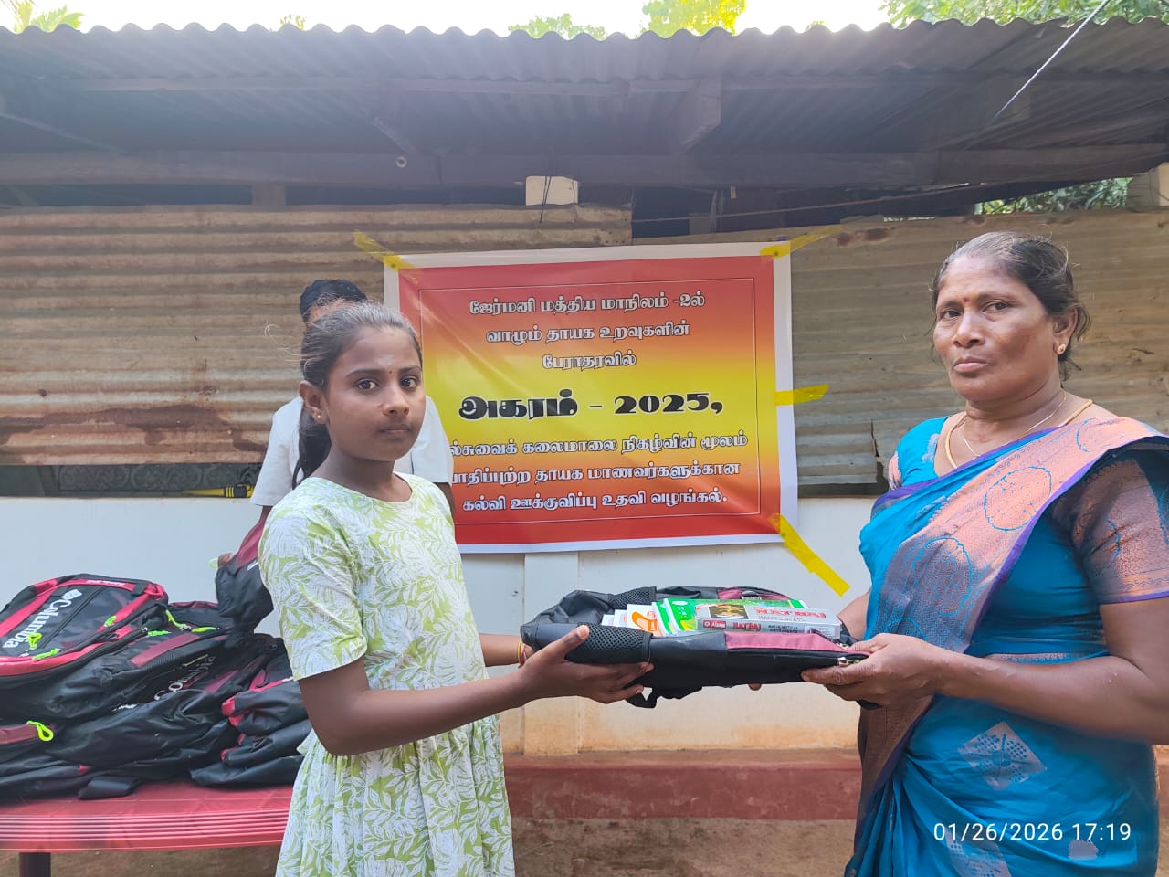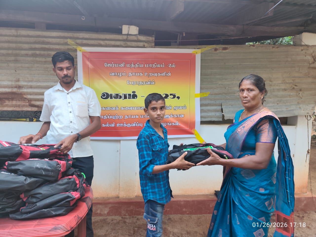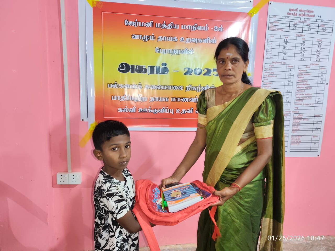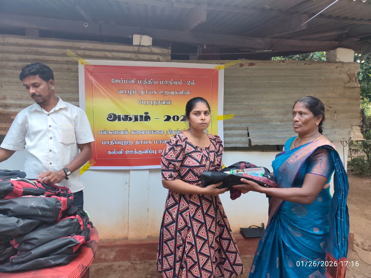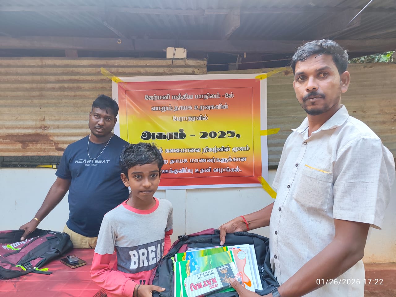 26/01/2026. முல்லைத்தீவு மாவட்டத்தின் மல்லாவி பிரதேசத்திற்குட்பட்ட அனிஞ்சியன்குளம், மற்றும் துணுக்காய் பிரதேசத்திற்குட்பட்ட அமைதிபுரம், ஆரோக்கியபுரம்ஆகிய கிராமங்களைச் சேர்ந்த மாணவர்களில் கடந்த மாதங்களில் ஏற்பட்ட வெள்ள அனர்த்தத்தால் மழை வெள்ளம் வீடுகளுக்குள் புகுந்து வீட்டு தளபாடங்கள் பாடசாலை உபகரணங்கள் அனைத்தும் பாதிக்கப்பட்ட நிலையில் உள்ள வறுமைக்குட் பட்ட 50 மாணவர்களுக்கு ஜேர்மன் மத்திய மாநிலம்-2ல் வாழும் தாயக உறவுகளின் பேராதரவில் அகரம்-2025 “பல்சுவை கலைமாலை”நிகழ்வின் மூலம் பாதிப்புற்ற தாயக மாணவர்களுக்கான கல்வி ஊக்குவிப்பு செயற்திட்டத்தின் கீழ்