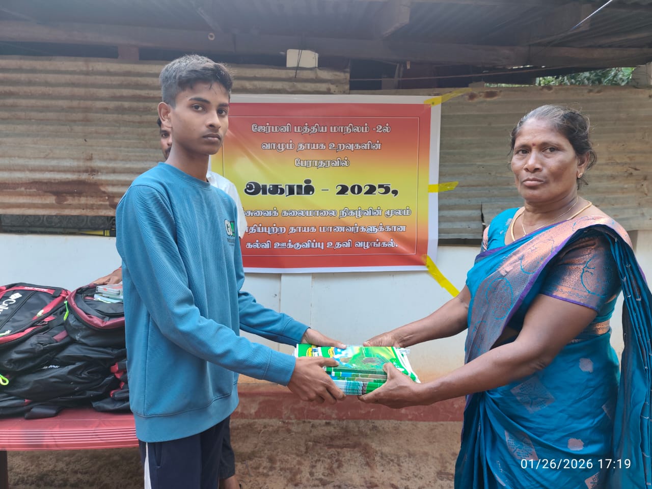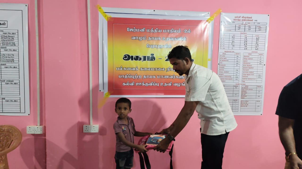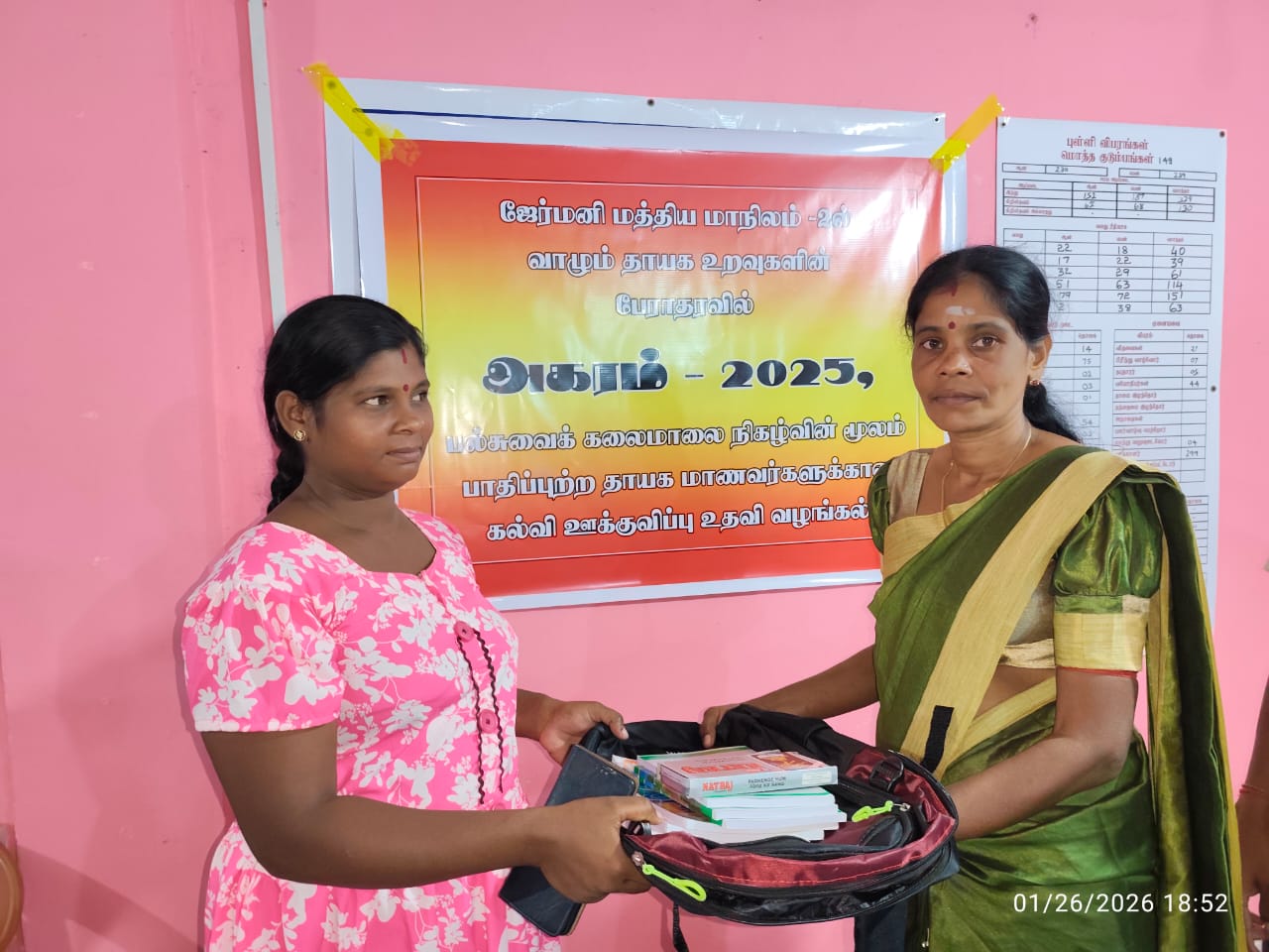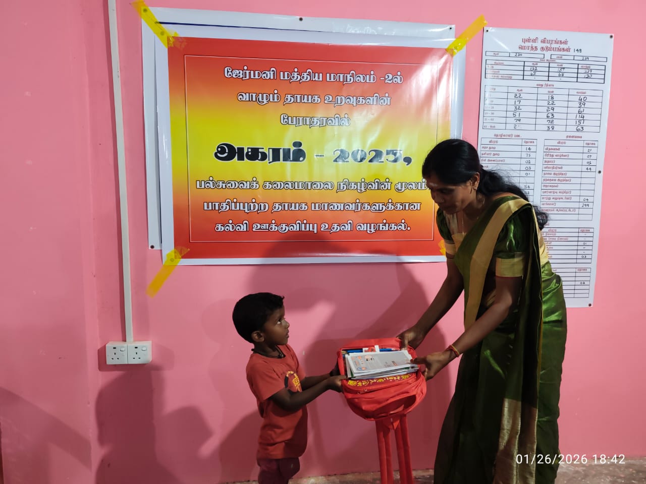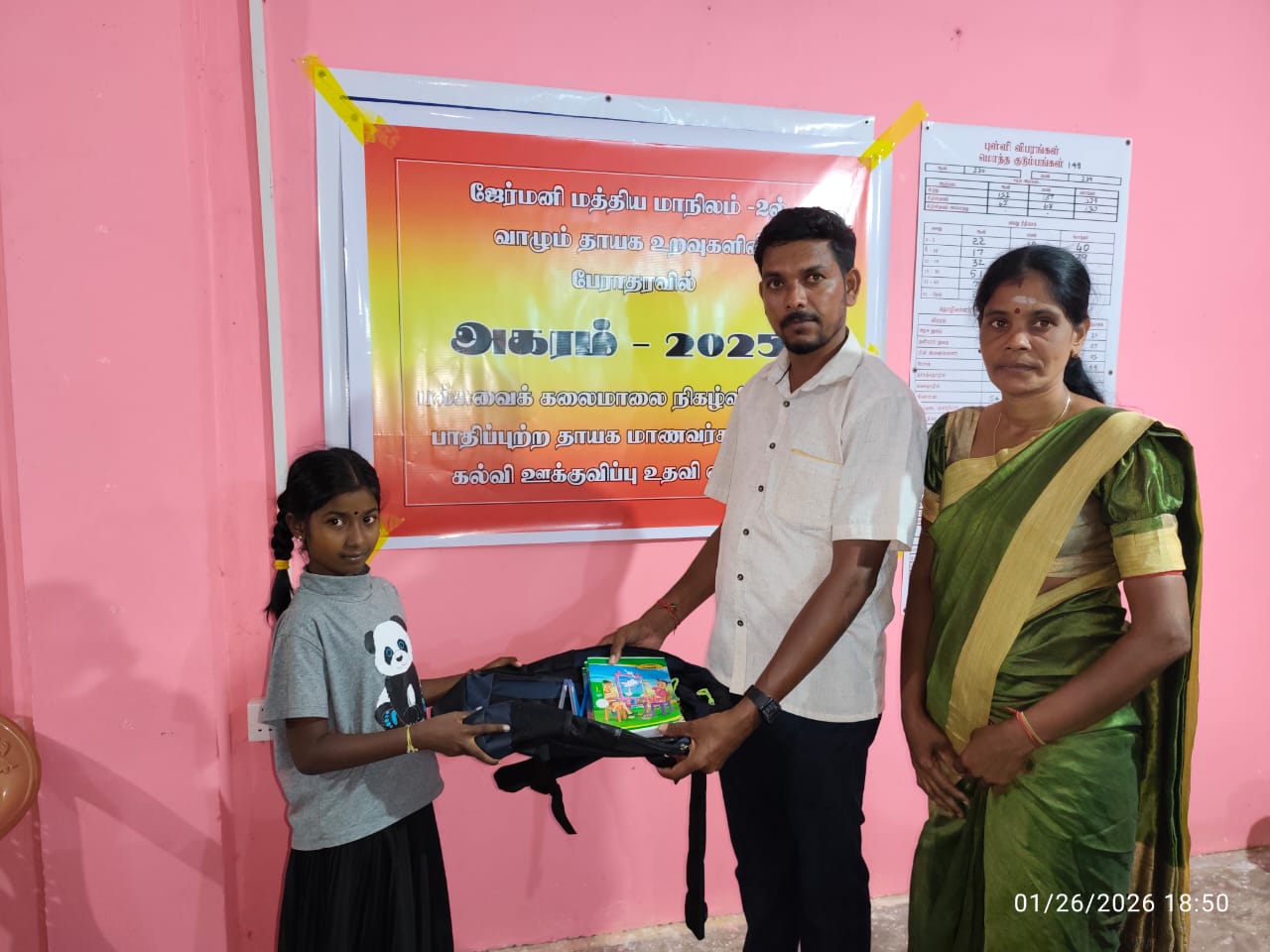 26/01/2026. முல்லைத்தீவு மாவட்டத்தின் மல்லாவி பிரதேசத்திற்குட்பட்ட அனிஞ்சியன்குளம், மற்றும் துணுக்காய் பிரதேசத்திற்குட்பட்ட அமைதிபுரம், ஆரோக்கியபுரம்ஆகிய கிராமங்களைச் சேர்ந்த மாணவர்களில் கடந்த மாதங்களில் ஏற்பட்ட வெள்ள அனர்த்தத்தால் மழை வெள்ளம் வீடுகளுக்குள் புகுந்து வீட்டு தளபாடங்கள் பாடசாலை உபகரணங்கள் அனைத்தும் பாதிக்கப்பட்ட நிலையில் உள்ள வறுமைக்குட் பட்ட 50 மாணவர்களுக்கு ஜேர்மன் மத்திய மாநிலம்-2ல் வாழும் தாயக உறவுகளின் பேராதரவில் அகரம்-2025 “பல்சுவை கலைமாலை”நிகழ்வின் மூலம் பாதிப்புற்ற தாயக மாணவர்களுக்கான கல்வி ஊக்குவிப்பு செயற்திட்டத்தின் கீழ்