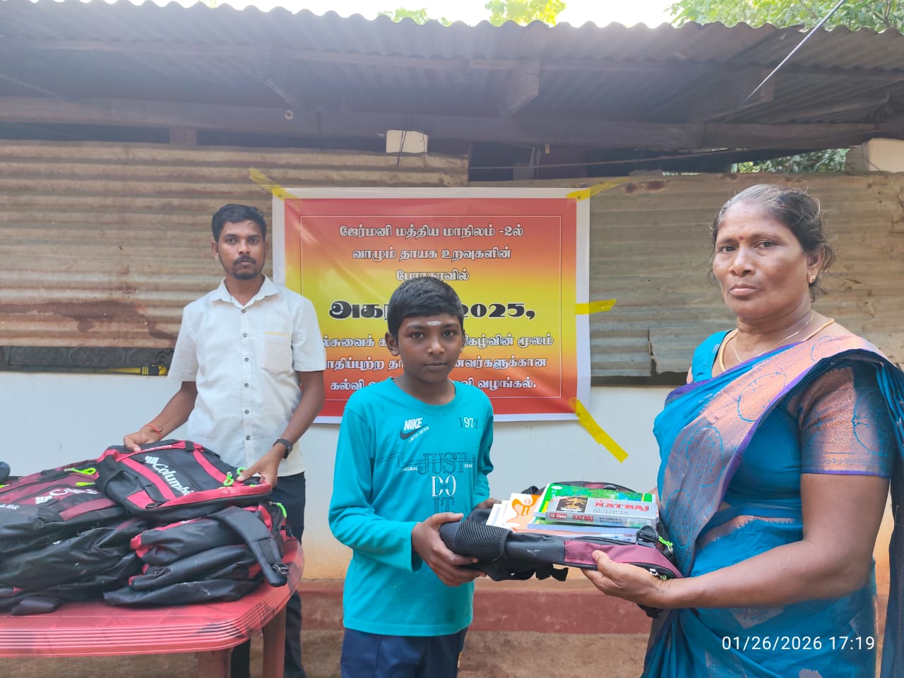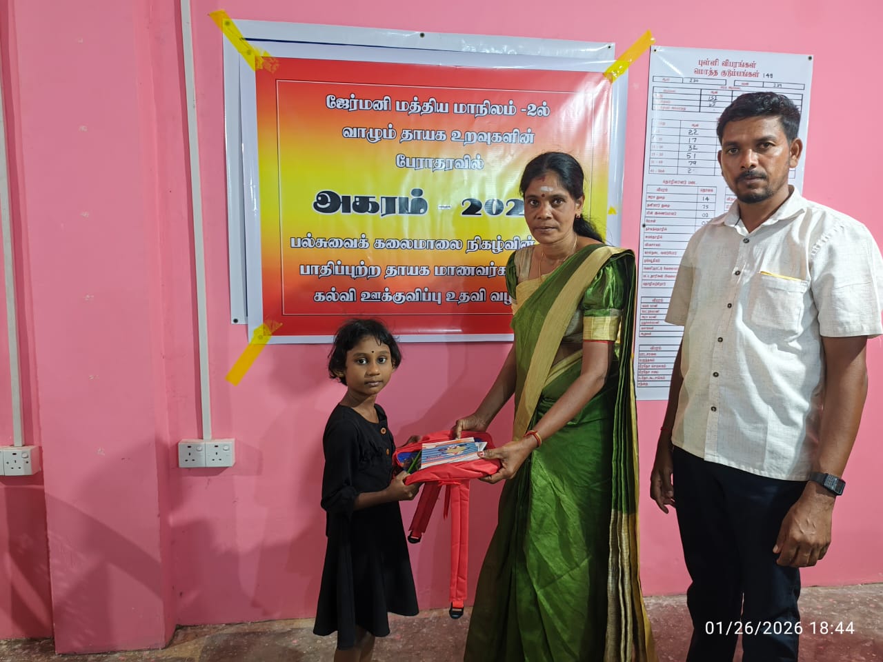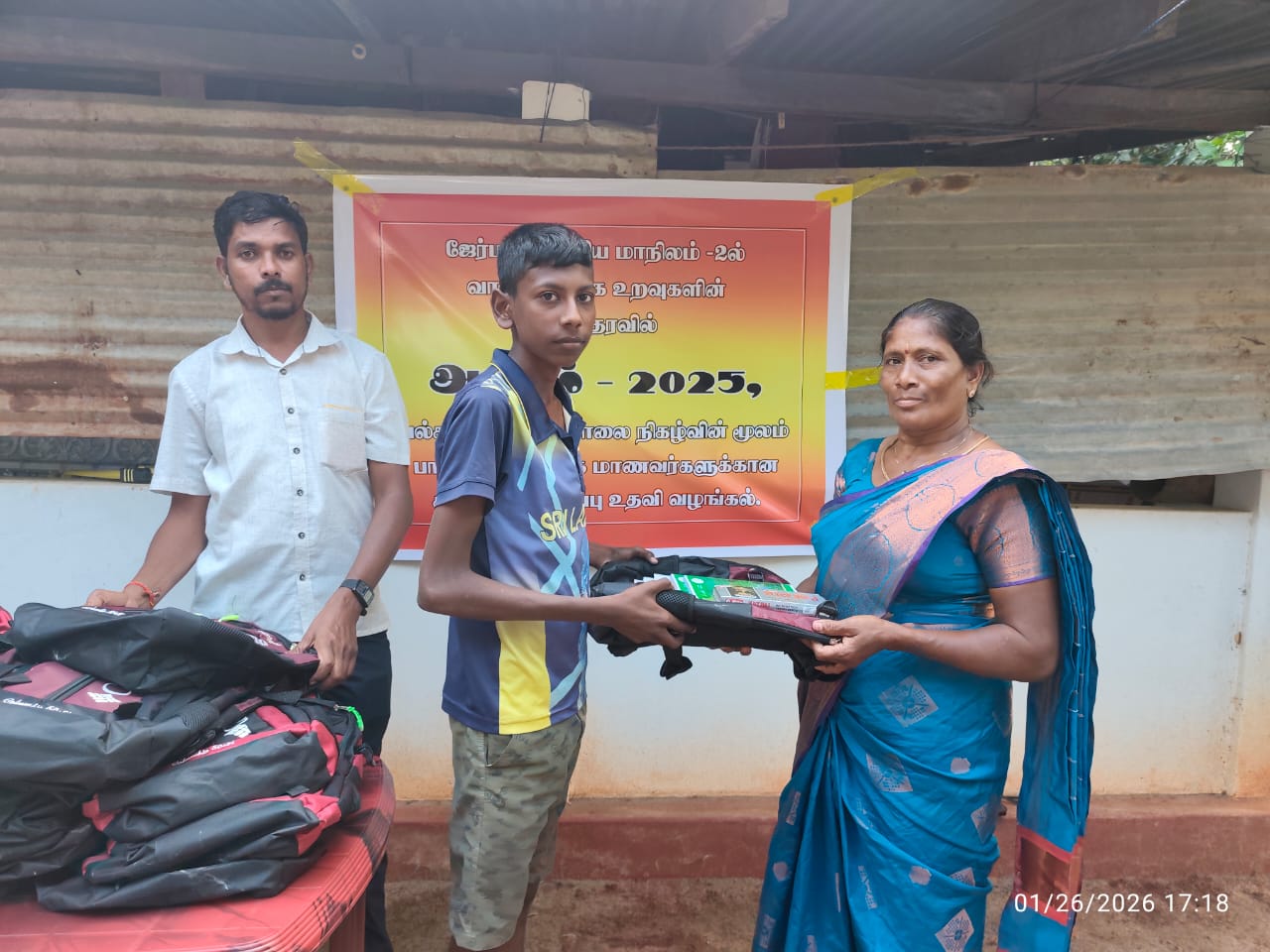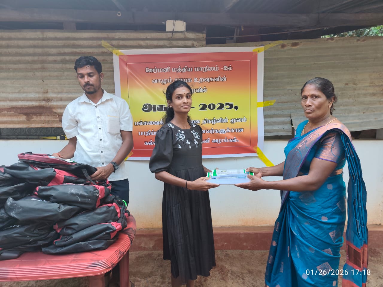 26/01/2026. முல்லைத்தீவு மாவட்டத்தின் மல்லாவி பிரதேசத்திற்குட்பட்ட அனிஞ்சியன்குளம், மற்றும் துணுக்காய் பிரதேசத்திற்குட்பட்ட அமைதிபுரம், ஆரோக்கியபுரம்ஆகிய கிராமங்களைச் சேர்ந்த மாணவர்களில் கடந்த மாதங்களில் ஏற்பட்ட வெள்ள அனர்த்தத்தால் மழை வெள்ளம் வீடுகளுக்குள் புகுந்து வீட்டு தளபாடங்கள் பாடசாலை உபகரணங்கள் அனைத்தும் பாதிக்கப்பட்ட நிலையில் உள்ள வறுமைக்குட் பட்ட 50 மாணவர்களுக்கு ஜேர்மன் மத்திய மாநிலம்-2ல் வாழும் தாயக உறவுகளின் பேராதரவில் அகரம்-2025 “பல்சுவை கலைமாலை”நிகழ்வின் மூலம் பாதிப்புற்ற தாயக மாணவர்களுக்கான கல்வி ஊக்குவிப்பு செயற்திட்டத்தின் கீழ்