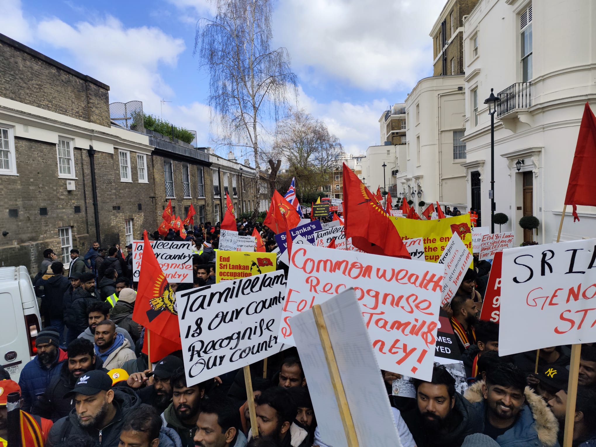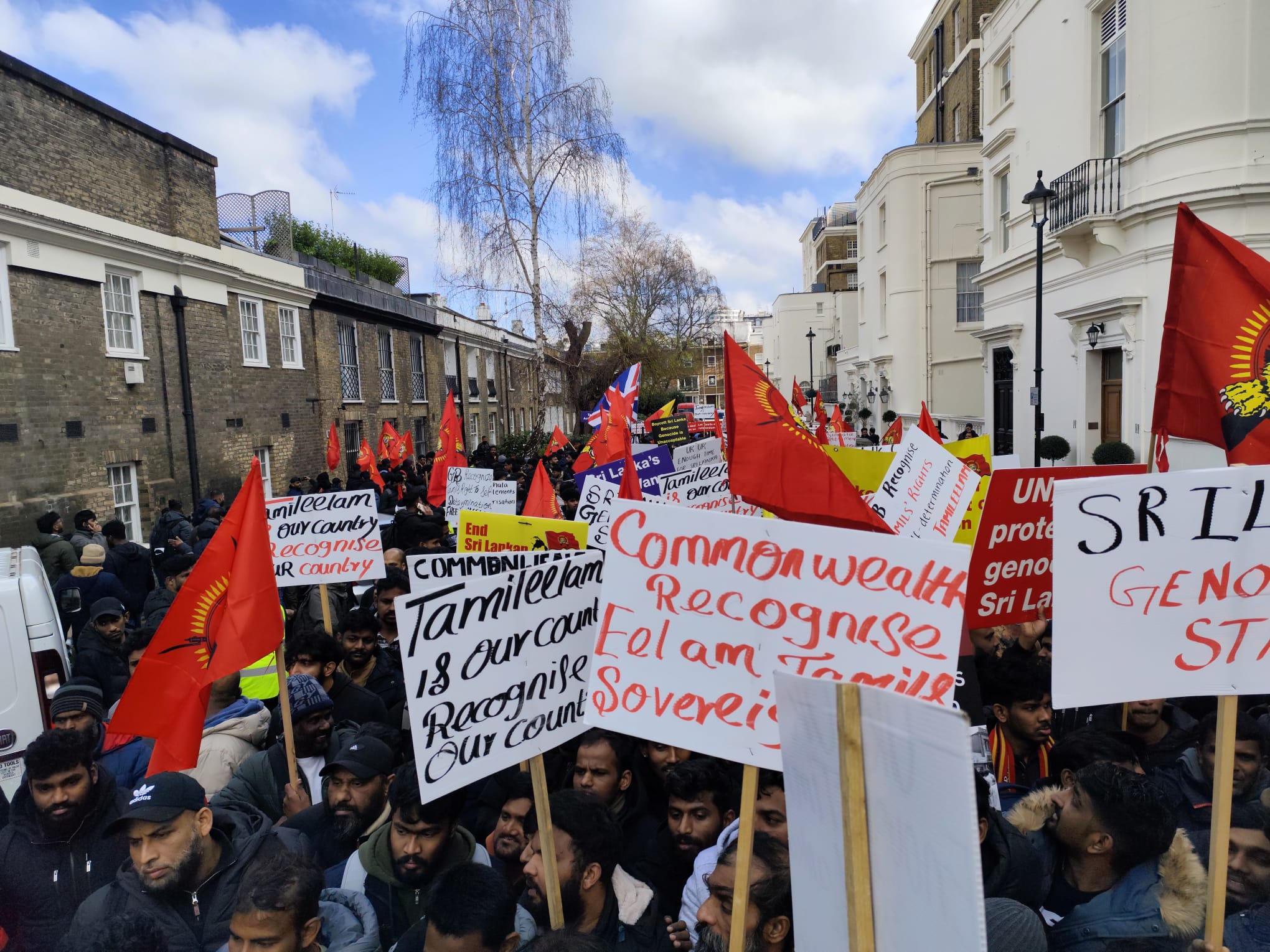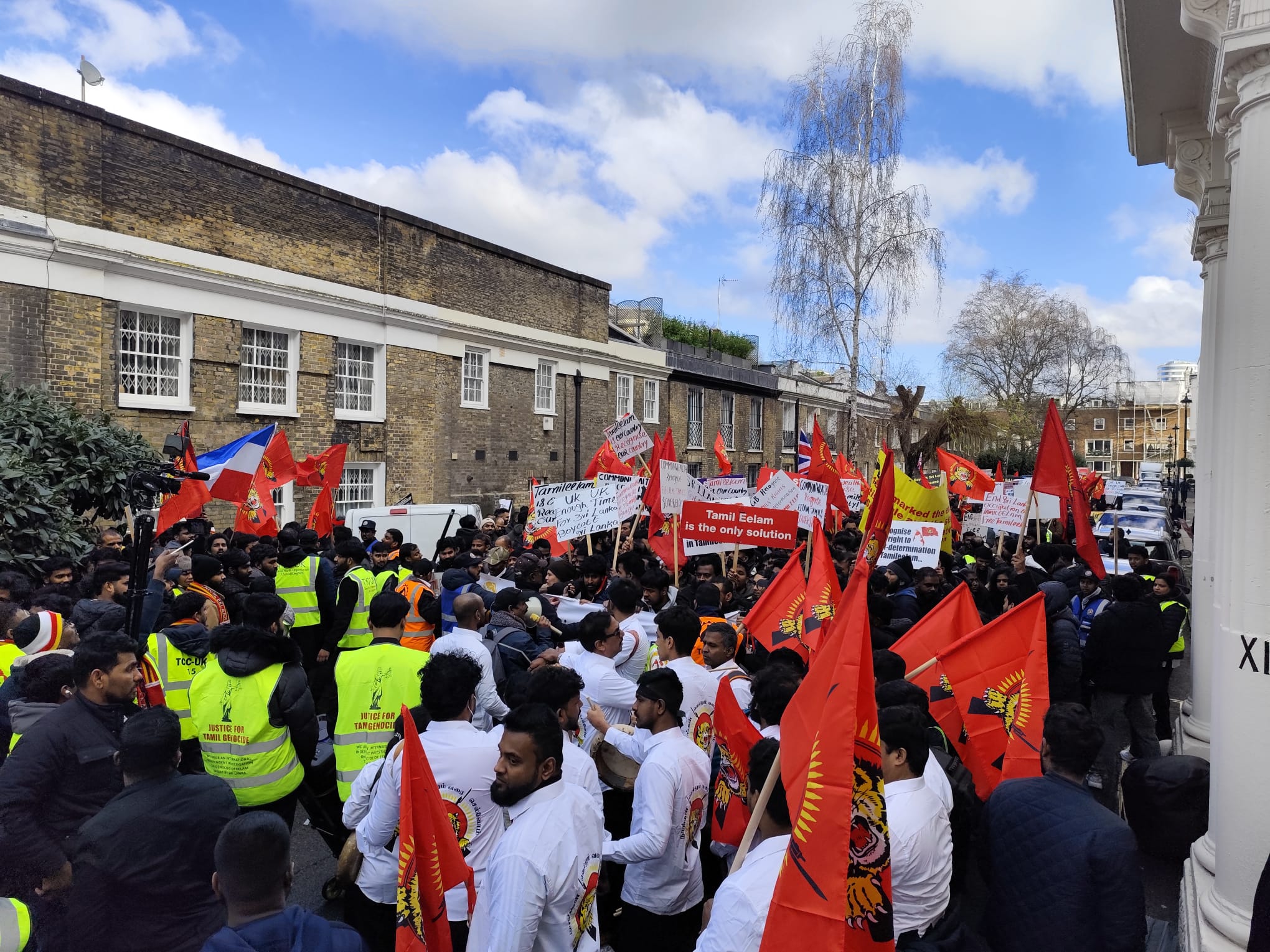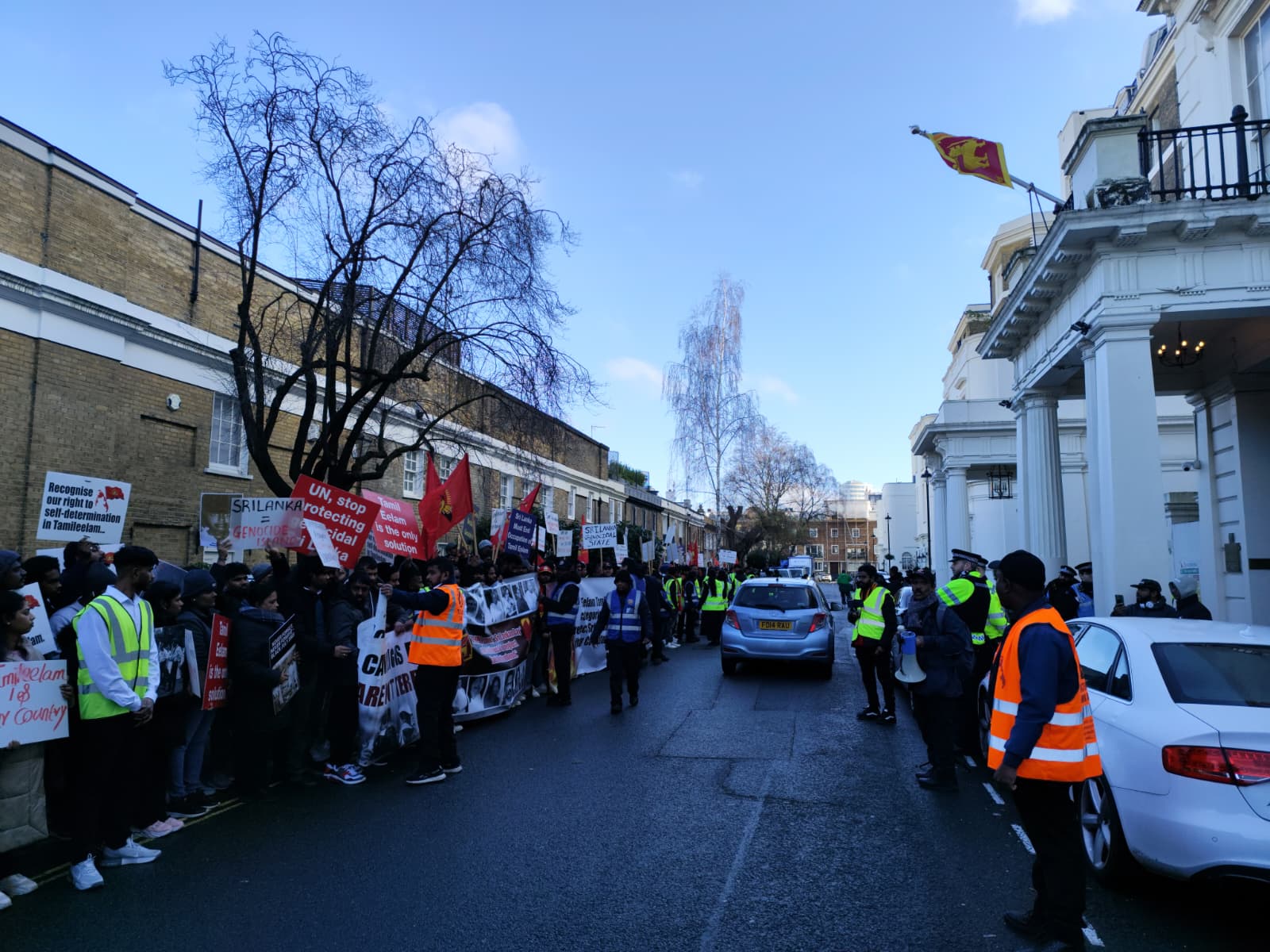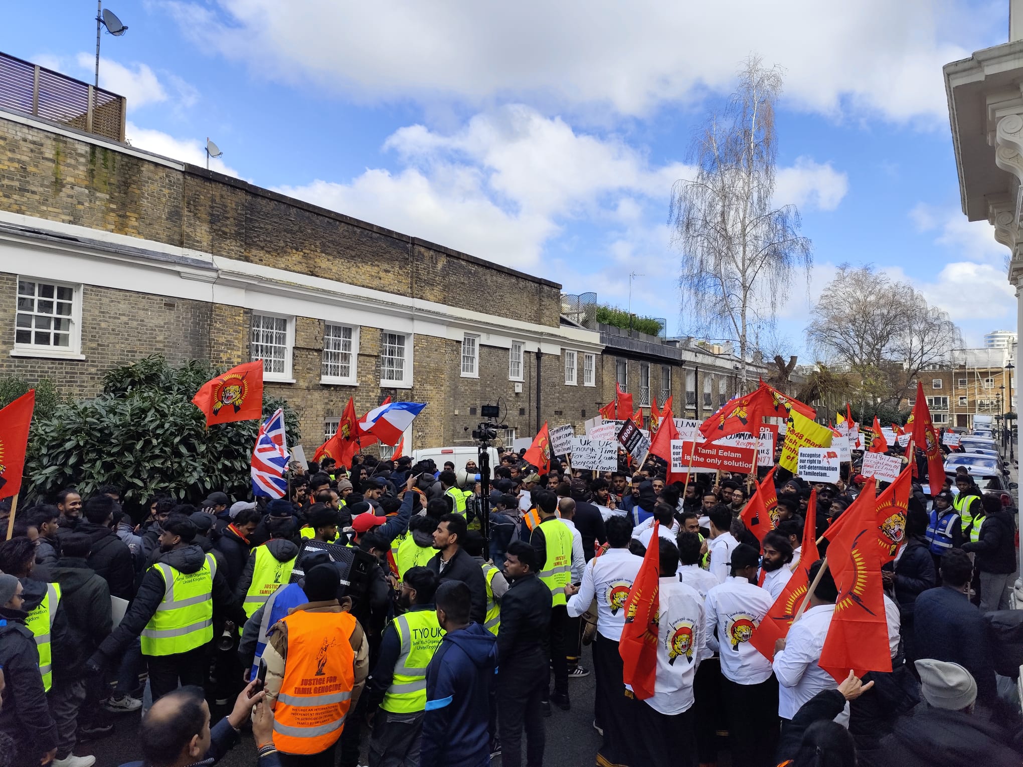 சிங்கள அரச தூதரகத்தின் முன் வானுயர ஒலித்திக்கொண்டிருக்கும் கொட்டொலிகள் மத்தியில் மாபெரும் போராட்டம் ஆரம்பித்துள்ளது.இப்போராட்டம் பிரித்தானிய மன்னர் மாளிகை நோக்கி நகரவுள்ளது.