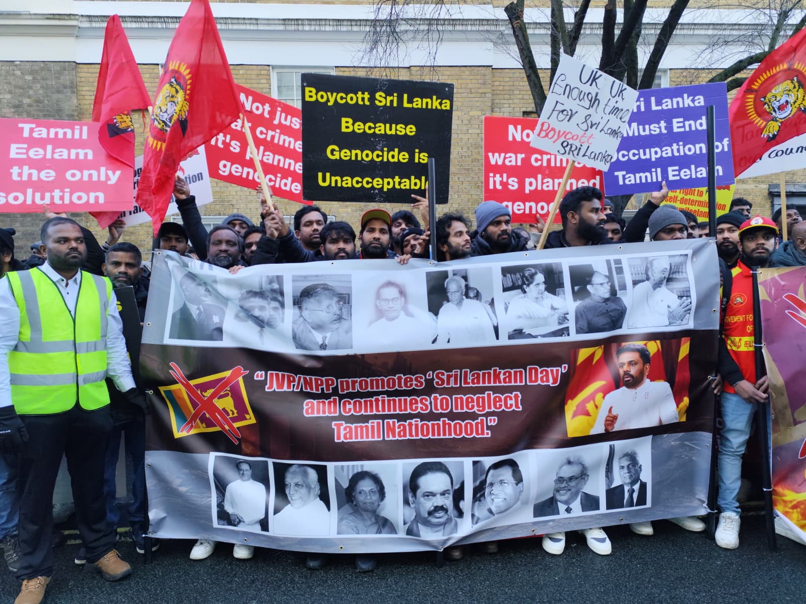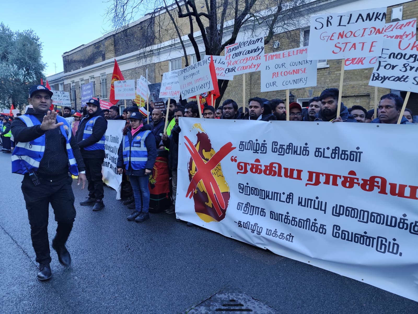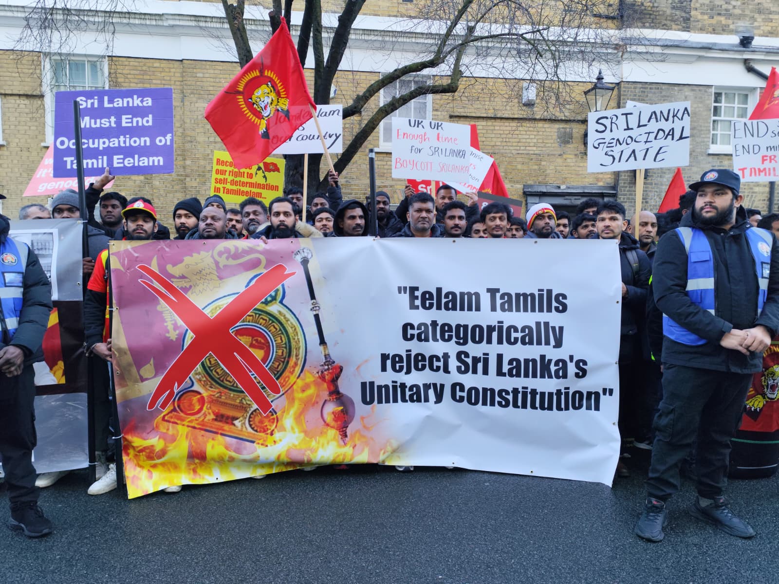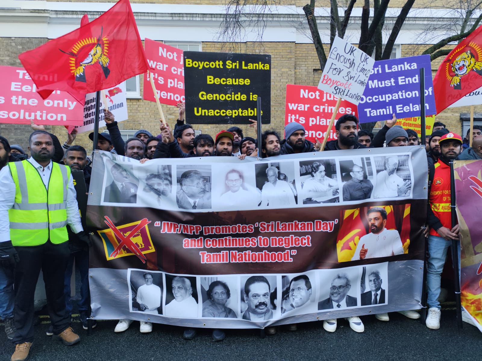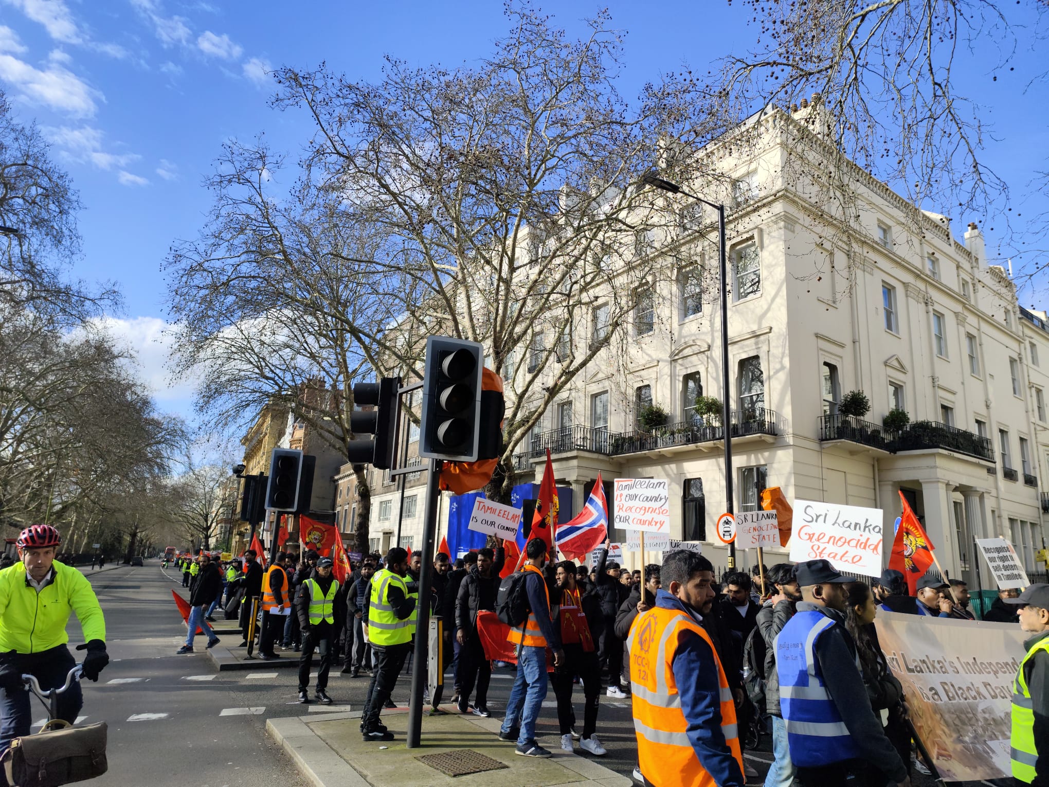 சிங்கள அரச தூதரகத்தின் முன் வானுயர ஒலித்திக்கொண்டிருக்கும் கொட்டொலிகள் மத்தியில் மாபெரும் போராட்டம் ஆரம்பித்துள்ளது.இப்போராட்டம் பிரித்தானிய மன்னர் மாளிகை நோக்கி நகரவுள்ளது.