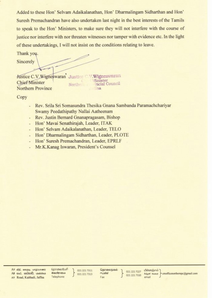 இது தொடர்பாக சற்று நேரத்திற்கு முன்னர் ஊடகவியலாளர்களுக்கு முதல்வர் விக்கினேஸ்வரன் கருத்து தெரிவிக்கும்போதே இதனை தெரிவித்தார்.