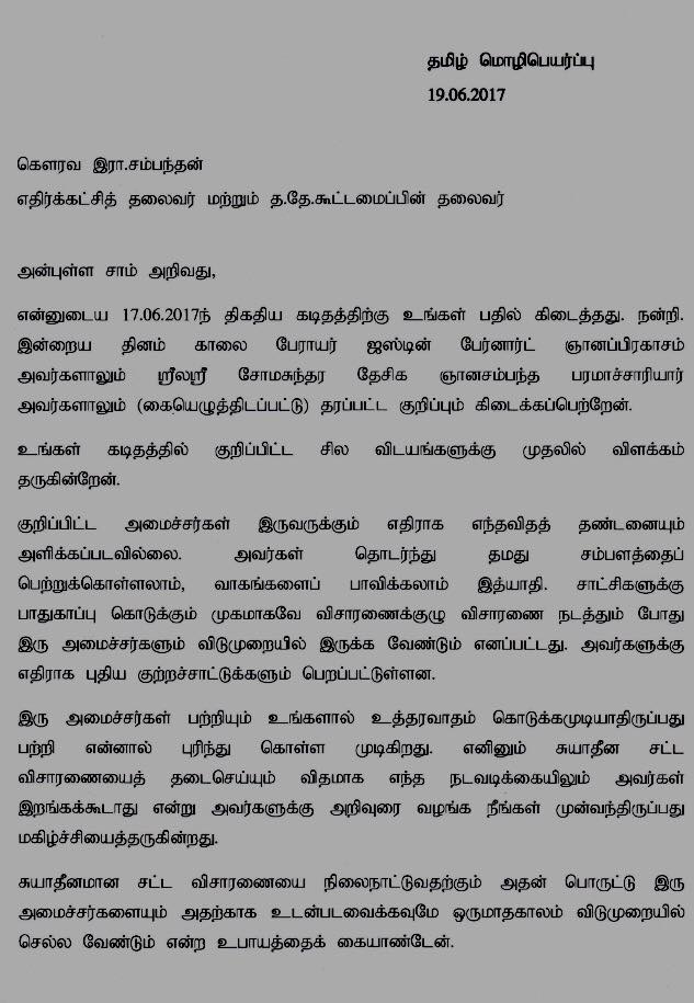 நம்பிக்கையில்லா தீர்மானம் ஒன்று கொண்டுவருவதானால் அதனை அவைத்தலைவரிடமே ஒப்படைக்கவேண்டும். ஆனால் இங்கு அவைத்தலைவர் இருந்தவர்களை கூட்டிக்கொண்டு ஆளுநர் அலுவலகத்திற்கு சென்றுள்ளார். எனினும் சபைக்கு பொதுவானவராக செயற்படவேண்டிய அவைத்தலைவர் சட்டவிரோதமாக செயற்பட்டுள்ளமையால் அவரை மாற்றுவது பற்றி பரிசீலிக்கப்படுவதாகவும் முதல்வர் தெரிவித்துள்ளார்.
