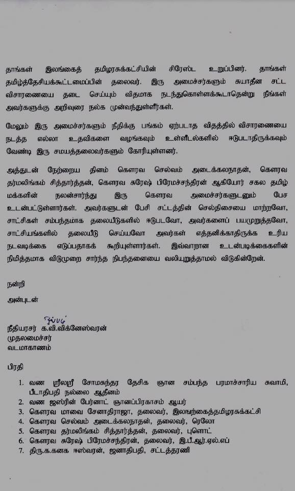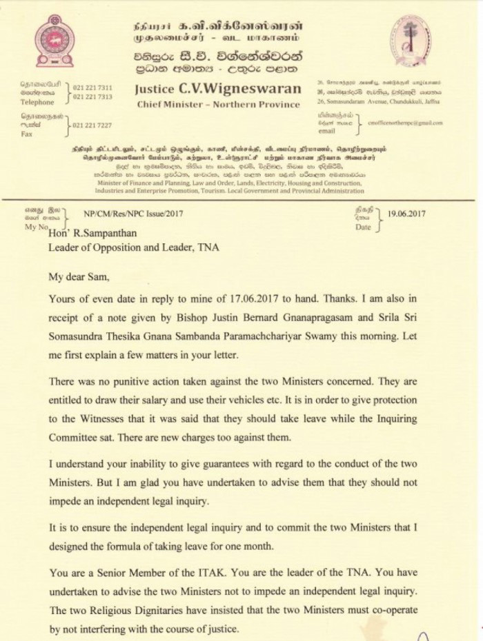 முதலமைச்சரினால் நியமிக்கப்பட்ட விசாரணைக்குழுவின் அறிக்கையின்படி ஊழல் குற்றச்சாட்டு நிரூபிக்கப்படாத இரண்டு அமைச்சர்களினதும் கட்டாய விடுப்பை வலியுறுத்தமாட்டேன் என வடமாகாண முதலமைச்சர் சி.வி.விக்னேஸ்வரன் தமிழ்த் தேசியக் கூட்டமைப்பின் தலைவர் இரா.சம்பந்தனுக்கு கடிதம் அனுப்பியுள்ளார்.