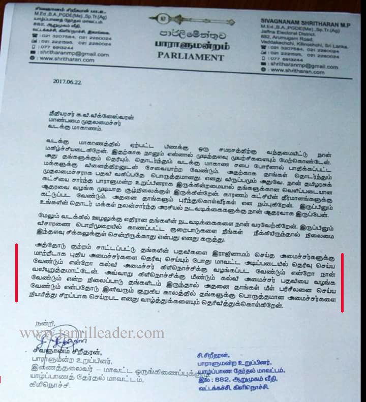 இந்த நிலையில் புதிய கல்வி அமைச்சரை கிளிநொச்சிக்கு வழங்கவேண்டாம் என மீண்டும் வலியுறுத்தி நாடாளுமன்ற உறுப்பினர் சிவஞானம் சிறீதரன் வடக்கு முதல்வர் சி.வி.விக்னேஸ்வரனுக்கு கடிதம் அனுப்பியிருக்கின்றார்.அந்தக் கடிதம் தற்போது வெளியாகி சர்ச்சையை ஏற்படுத்தியிருக்கின்றது.