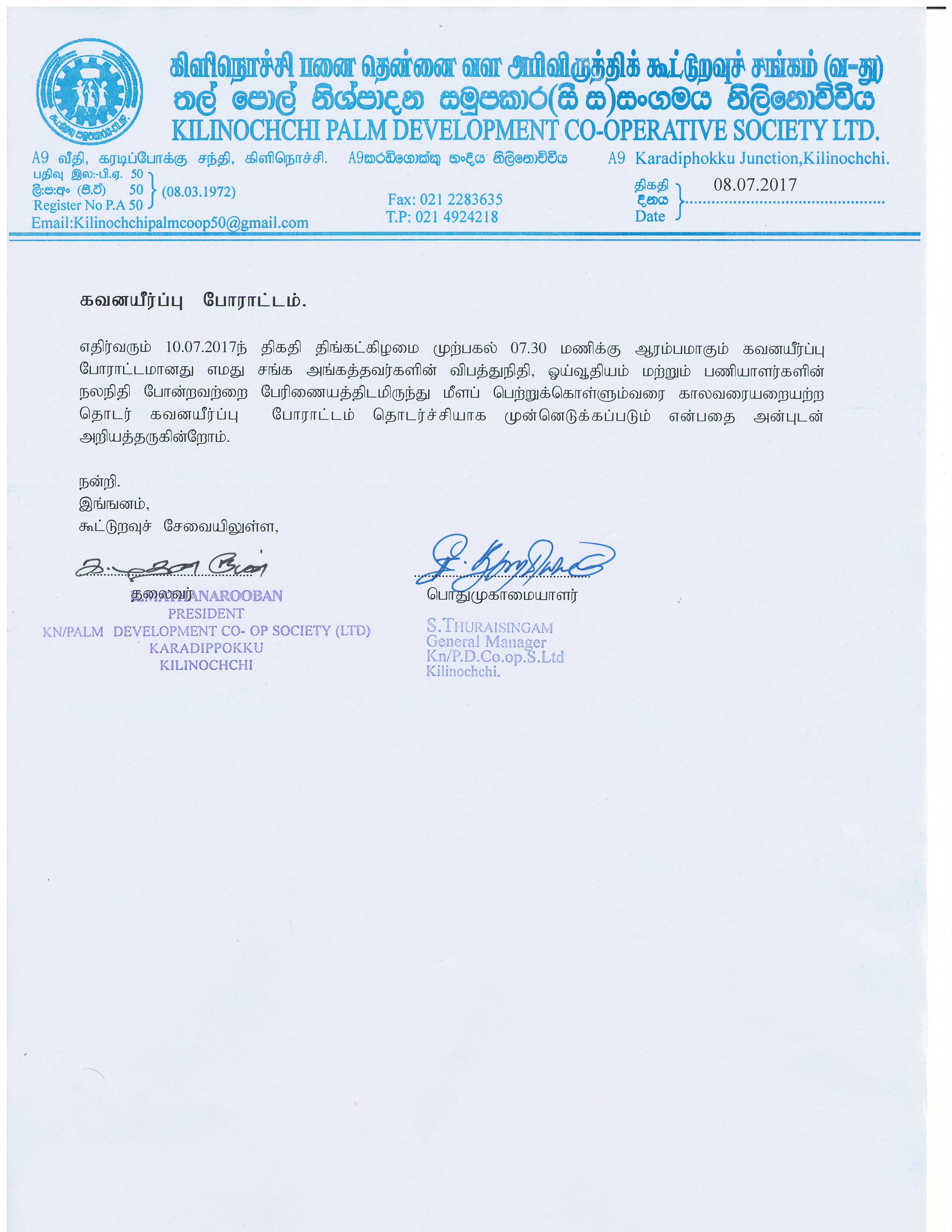 எதிர்வரும் திங்கட்கிழமை காலை 07.30 மணி தொடக்கம் கிளிநொச்சி டிப்போச் சந்திக்கு அருகாமையில் அமைந்துள்ள கிளிநொச்சி மாவட்ட கூட்டுறவு ஆணையாளர் அலுவலகத்தை முற்றுகையிட்டு கவனயீர்ப்பு போராட்டம் முன்னெடுக்கப்படவுள்ளது.