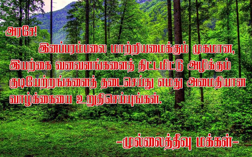 எம் தேசத்தை பாலைவனமாக்க அனுமதியோம் முல்லைத்தீவு மாவட்டத்தில் கூழாமுறிப்பு பகுதியில் பாரியளவிலான வன அழிப்பை மேற்கொண்டு, இனப் பரம்பலை சிதைக்கும் நோக்குடனான குடியேற்றத்தை தடுத்து நிறுத்தவேண்டிய கட்டாயத்தில் நாம் இருக்கின்றோம்.