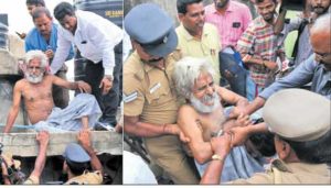 அரசுக்கு எதிராக டிராபிக் ராமசாமி 4 மாடி கட்டிடத்தில் ஏறி தற்கொலை மிரட்டல் போராட்டத்தில் ஈடுபட்டார். போலீசார் அவரை குண்டுக்கட்டாக தூக்கி சென்றனர்.