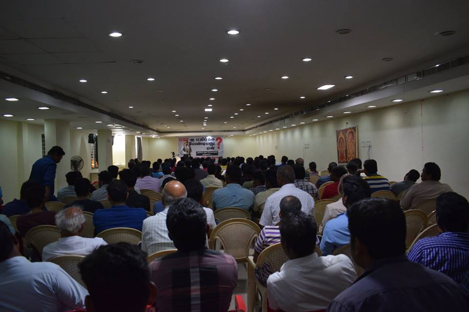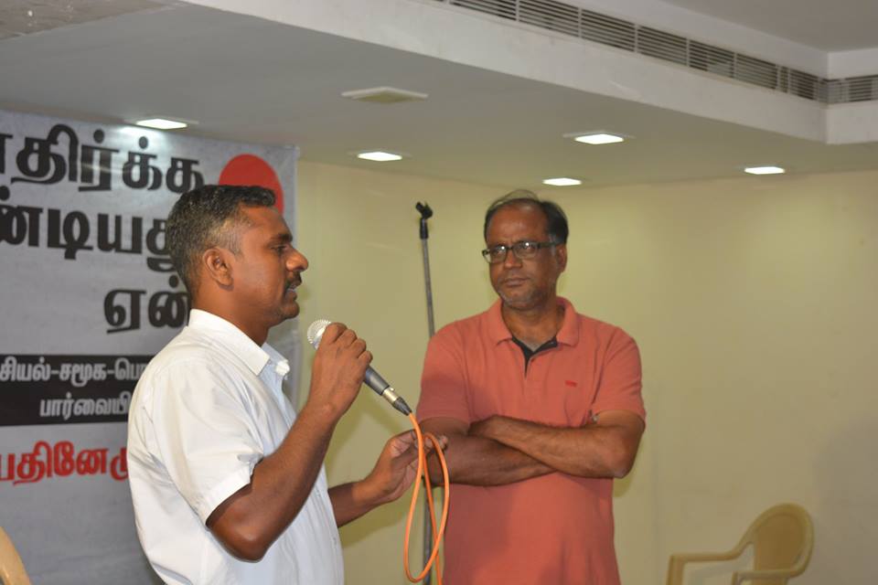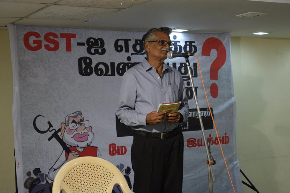 GST-யை எதிர்க்க வேண்டியது ஏன் எனும் GST வரி விதிப்பு மற்றும் அதன் பின்னணிகள் குறித்து விளக்கும் கருத்தரங்கம் மே பதினேழு இயக்கத்தினால் 16-7-17 ஞாயிறு அன்று சென்னையில் நடத்தப்பட்டது.நிகழ்வின் தொடக்கத்தில் தமிழ்த்தேசியப் போராளி ஓவியர் வீரசந்தானம் அவர்களுக்கு அஞ்சலி செலுத்தப்பட்டது.