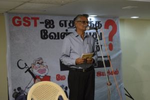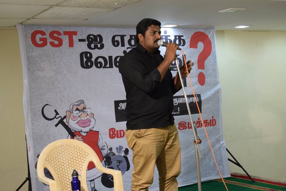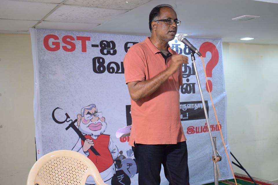 GST வரி விதிப்பு ஜனநாயக மறுப்பு என்றும், எளிய மக்களின் வாழ்க்கையை இந்திய ஒன்றிய பாஜக அரசின் இந்த GST வரி விதிப்பு எப்படியெல்லாம் சிதைக்கப் போகிறது என்பதைக் குறித்து விளக்கினர்.Informal sector எனப்படக்கூடிய 90 சதவீத மக்கள் நேரடியாக பங்கு பெறக்கூடிய அமைப்பு சாரா தொழில்களான சிறு, குறு, பாரம்பரிய தொழில்களை வரி விதிப்பின் கீழ் கொண்டு வந்து அழிப்பதை நோக்கமாகக் கொண்டு வடிவமைக்கப்பட்டிருப்பதை ஆவணங்களுடன் விளக்கினர். GST பெரு நிறுவனங்களுக்கு எப்படியெல்லாம் சேவை செய்யப்போகிறது என்பது குறித்தும் விளக்கினர்.