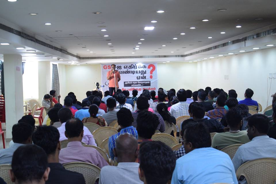 GSTயின் மூலம் ”ஒரே நாடு, ஒரே வரி” என்ற பெயரில் அரசியலமைப்பு சட்டத்துக்கு விரோதமாக மாநில அரசுகளின் அதிகாரங்கள் பறிக்கப்பட்டு, மாநில சுயாட்சி உரிமை அழிக்கப்படுவதையும், இந்த உரிமை மீறலை எதிர்த்துக் குரலெழுப்ப வேண்டியதன் அவசியத்தையும் குறித்து முழுமையாகப் பேசினர்.மே பதினேழு இயக்க ஒருங்கிணைப்பாளர் அருள்முருகன் மற்றும் தமிழ்நாடு மின்துறை பொறியாளர் அமைப்பின் சா.காந்தி ஆகியோர் விளக்க உரையாற்றினர்.