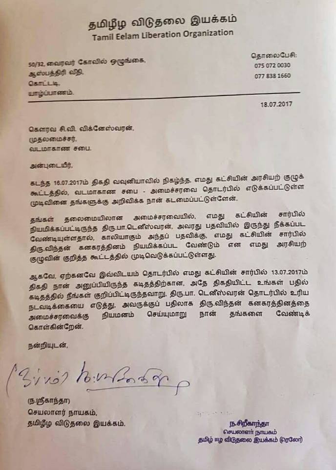 வடக்கு மாகாண அமைச்சரவையில் ரெலோ சார்பில் போக்குவரத்து அமைச்சராக இருந்த அமைச்சர் பா.டெனீஸ்வரனை நீக்கி விட்டு அவருக்குப் பதிலாக மாகாண சபை உறுப்பினர் விந்தன் கனகரட்ணத்தை நியமிக்கக் கோரும் கடிதத்தை, கட்சியின் செயலாளர் ந.சிறீக்காந்தா, வடக்கு மாகாண முதலமைச்சர் சி.வி.விக்னேஸ்வரனிடம் இன்று(18) கையளித்துள்ளார்.