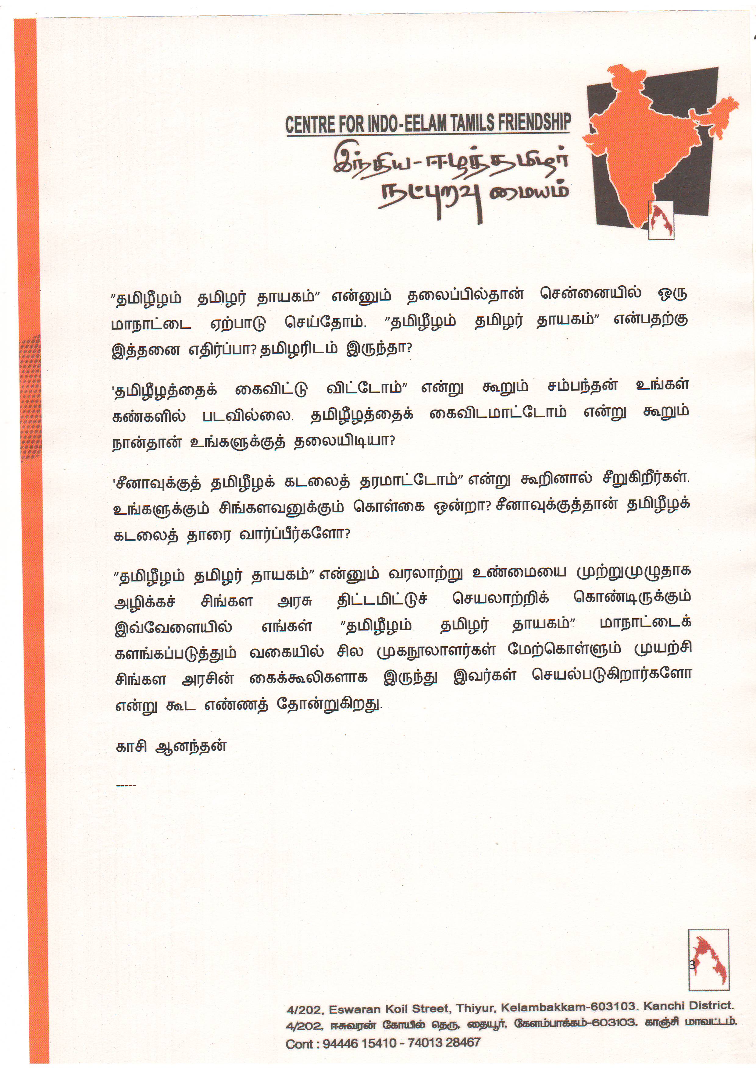 ‘இந்து மகாகடலில் நிகழும் சீனாவின் ஆக்கிரபிப்புப் போரில் நாங்கள் இந்தியாவுக்கு ஆதரவாக இருப்போம். தமிழீழத்தில் நிகழும் சிங்களவனின் அடக்குமுறைக்கு எதிரான போரில் இந்தியா எங்களுக்கு ஆதரவாக இருக்க வேண்டும்’ என்பதுதான் எங்கள் ‘இந்திய-ஈழத்தமிழர் நட்புறவு மையத்தின்’ கொள்கையாகும்.