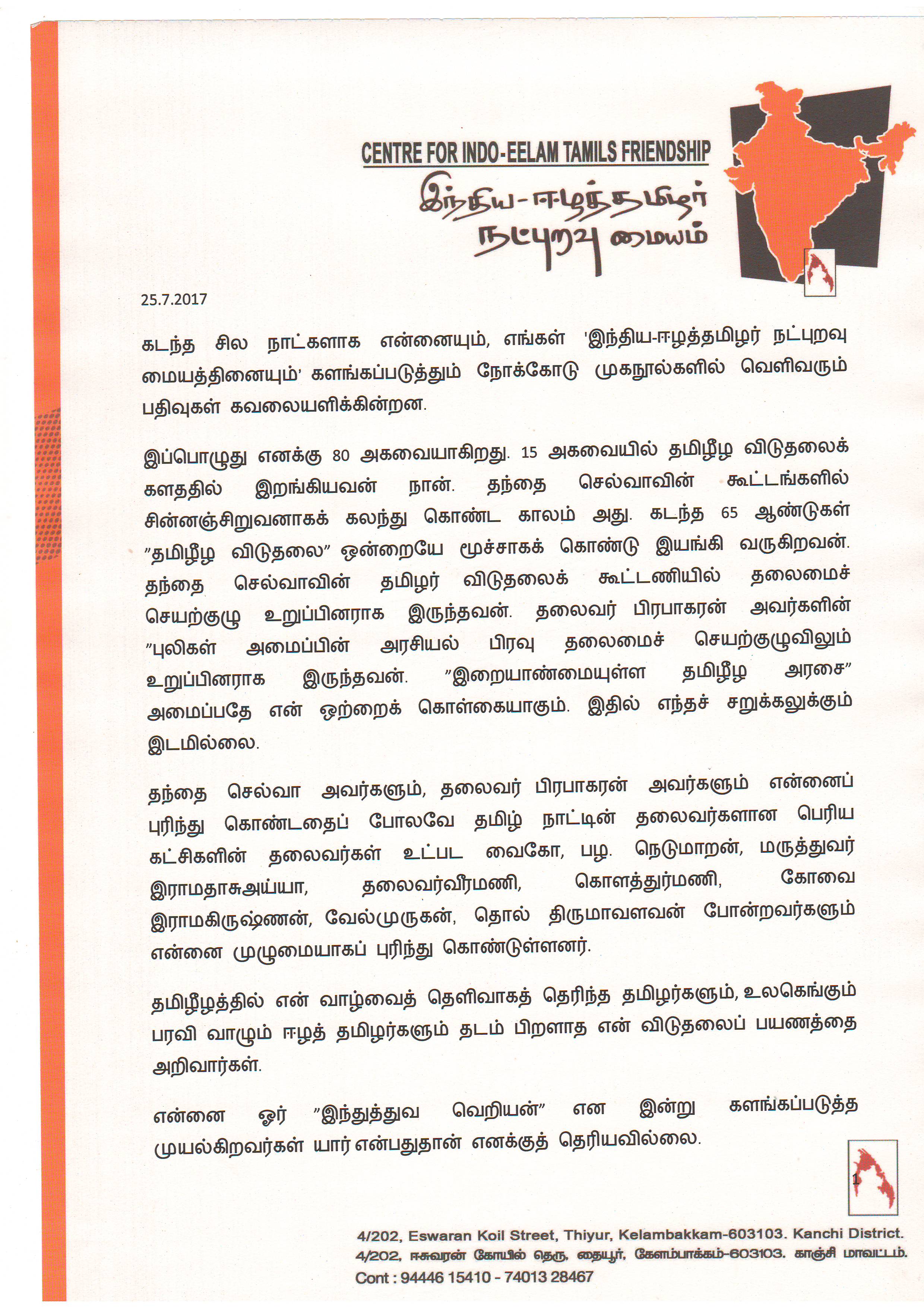 கடந்த சில நாட்களாக என்னையும் எங்கள் ‘இந்திய-ஈழத்தமிழர் நட்புறவு மையத்தினையும்’ களங்கப்படுத்தும் நோக்கோடு முகநூல்களில் வெளிவரும் பதிவுகள் கவலையளிக்கின்றன.