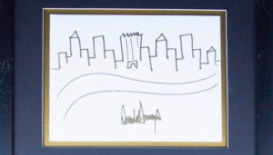 அமெரிக்காவின் முக்கிய நகரமாக மான்ஹட்டனில் உள்ள வானுயர்ந்த கட்டிடங்களை குறிக்கும் விதமாக கடந்த 2005 ஆம் ஆண்டில் தொண்டு நிறுவனத்திற்காக நடத்தப்பட்ட ஏலம் ஒன்றிற்காக ஓவியம் டொனால்ட் டிரம்ப்பால் வரையப்பட்டது. எனினும், இந்த ஓவியத்தில் தனக்கு சொந்தமான ’டிரம்ப் டவர்’ கட்டிடத்தை முன்னிலைப்படுத்தி ஓவியத்தை டிரம்ப் வரைந்திருப்பார்.
