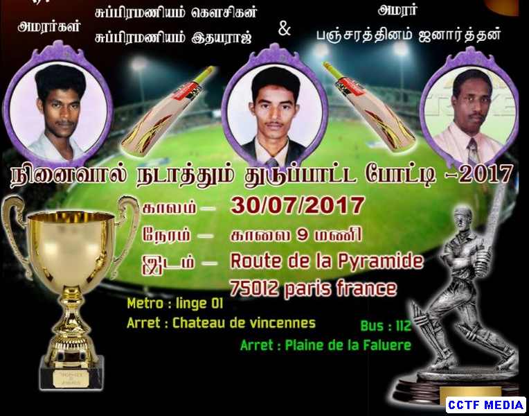 பிரான்சில் அரியாலை ஐக்கிய கழகம் நடாத்திய துடுப்பெடுத்தாட்டப்போட்டி! பிரான்சு தமிழர் ஒருங்கிணைப்புக்குழு தமிழர் விளையாட்டுத்துறையின் ஆதரவில் அரியாலை ஐக்கியகழகம் அமரர்கள் சுப்பிரமணியம் கௌசிகன், சுப்பிரமணியம் இதயராஜ், பஞ்சரத்தினம் ஜனார்த்தனன் ஆகியோரின் நினைவாக 5 ஆவது தடவையாக நடாத்திய துடுப்பெடுத்தாட்டப்போட்டி கடந்த 30.07.2017 ஞாயிற்றுக்கிழமை Chateau de vincennes பகுதியில் விறுவிறுப்பாக இடம்பெற்றது.