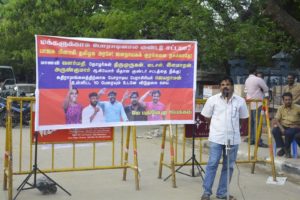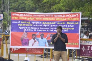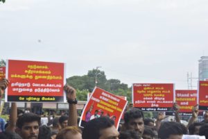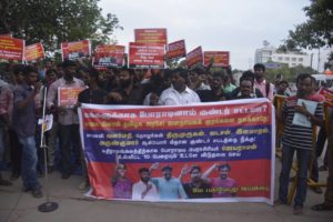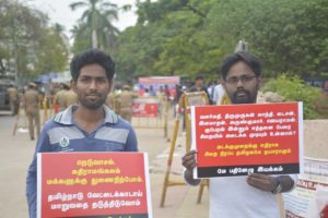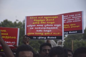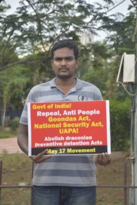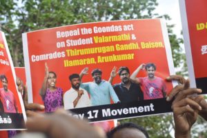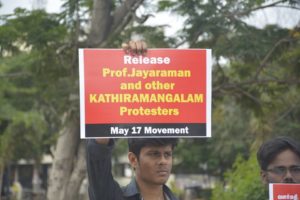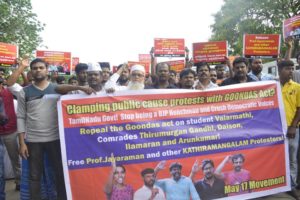 மாணவி வளர்மதி, தோழர்கள் திருமுருகன் காந்தி, டைசன், இளமாறன், அருண்குமார் ஆகியோர் மீதான குண்டர் சட்டத்தினை ரத்து செய்ய வலியுறுத்தியும், கதிராமங்கலத்தில் போராடிய பேராசிரியர் ஜெயராமன் உள்ளிட்ட 10 தோழர்களையும் விடுதலை செய்ய வலியுறுத்தியும் கண்டன ஆர்ப்பாட்டம் மே பதினேழு இயக்கம் சார்பில் 30-7-2017 ஞாயிறு அன்று வள்ளுவர் கோட்டத்தில் நடத்தப்பட்டது.