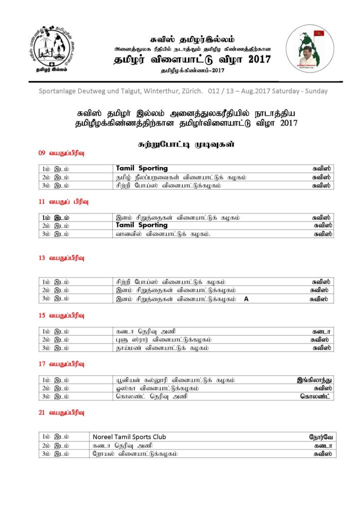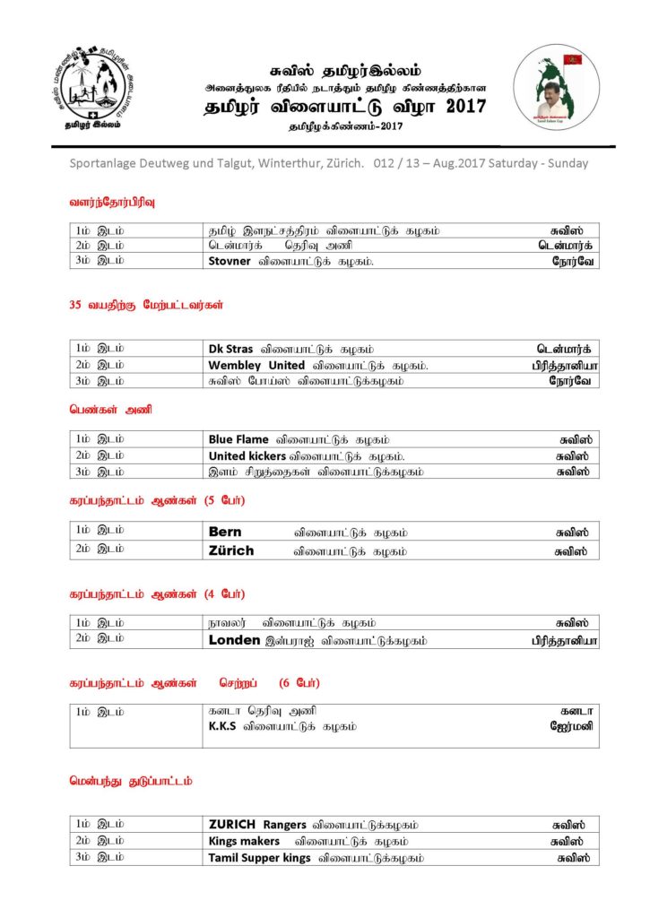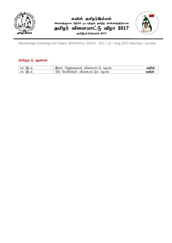சுவிஸ் தமிழர் இல்லம் அனைத்துலக ரீதியில் 16வது தடவையாக நடாத்திய தமிழீழக் கிண்ணத்திற்கான தமிழர் விளையாட்டுவிழா 2017 ஓகஸ்ட் மாதம் 12ம், 13ம் திகதிகளில் சூரிச் வின்ரத்தூர் நகரில் அமைந்துள்ள ளுpழசவயடெயபந னுநரவவறநப மைதானத்தில் வெகுசிறப்பாக நடைபெற்று முடிந்தது. புலம் பெயர்ந்து வாழும் எமது இளம் தலைமுறையினரிடம் தாயகம் நோக்கிய தேடலை ஏற்படுத்தும் நோக்கில் தமிழர் இல்லம் இச்சுற்றுப் போட்டியினை நடாத்தி வருகின்றது. நடைபெற்று முடிந்த இந்நிகழ்வில் பங்கேற்பதற்காக ஐரோப்பாவின் பல்வேறு பகுதிகளிலிருந்தும், பிரித்தானியா, கனடா நாடுகளிலிருந்தும் அணிகள் கலந்து சிறப்பித்திருந்தன.