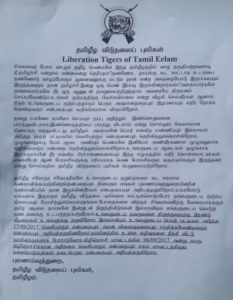 வவுனியாவில் தமிழீழ விடுதலைப் புலிகளின் இலச்சினை பொறிக்கப்பட்ட கடிதத் தலைப்புகளுடன் துண்டுப்பிரசுரங்கள் பல இடங்களில் விநியோகிக்கப்பட்டுள்ளன.