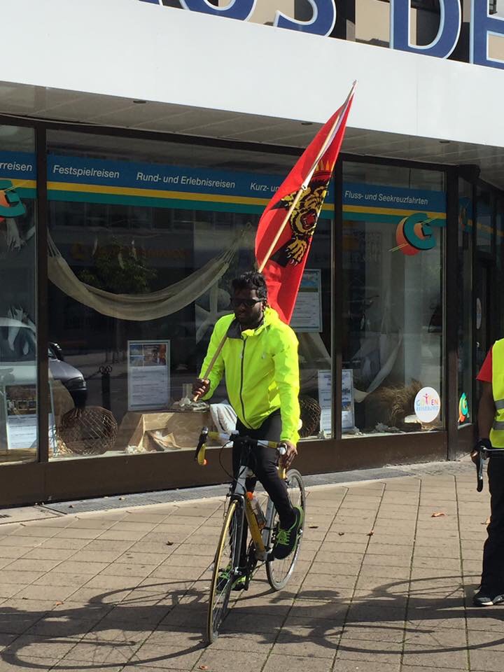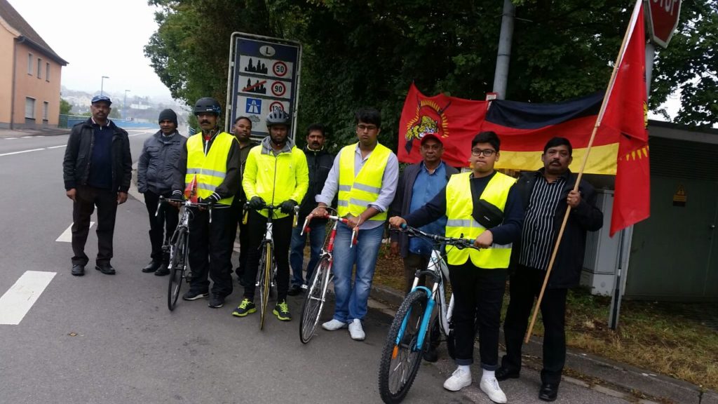 தமிழின அழிப்புக்கு பன்னாட்டு விசாரணையை வலியுறுத்தி ஐரோப்பிய ஒன்றியத்துக்கு முன்பாக ஆரம்பிக்கப்பட்ட மனிதநேய ஈருருளிப் பயணம் ஐந்தாவது நாளாக மீண்டும் நேற்றைய தினம் அகவணக்கத்துடன் ஆரம்பிக்கப்பட்டு யேர்மன் நாட்டின் சார்புருக்கன் நகரத்தை கடந்து பிரான்சு நாட்டை நோக்கி பயணித்தது. நேற்றைய பயணத்தில் வேற்றின ஈருருளிப் பயண வீரர்களோடு ஏற்பட்ட சந்திப்பில் எமது மனிதநேய ஈருருளிப் பயணத்தின் நோக்கத்தை தெளிவுபடுத்தியதோடு துண்டுப்பிரசுரங்களையும் வழங்கினார்கள். இன்றைய தினத்தில் பிரான்சு கிழக்கு பிராந்திய நகர பிதாக்களுடன் சந்திப்புகள் நடைபெறுவதோடு மற்றும் மக்கள் சந்திப்புகளுடன் மாவீரர்கள் தியாகத்தை சுமந்து பயணிக்கும்.
