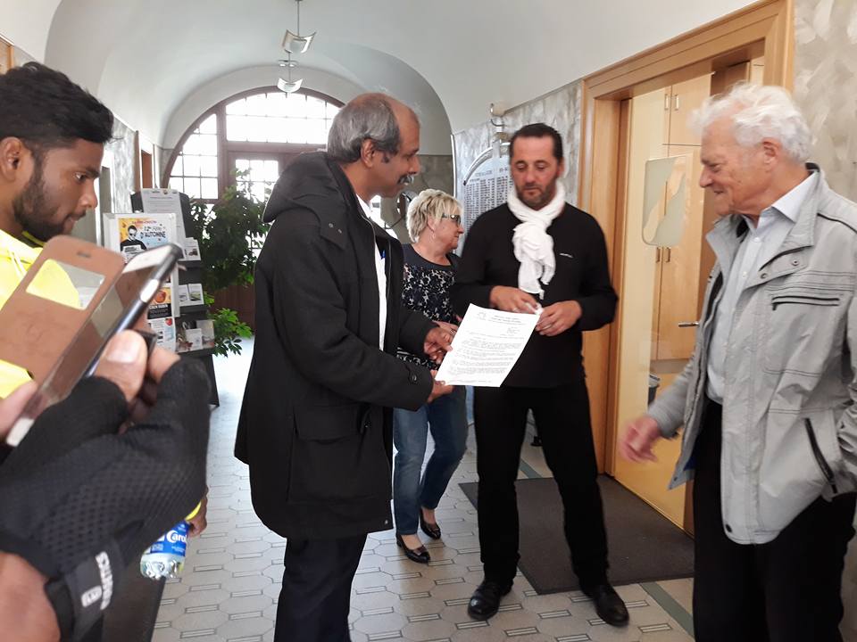 பிரஞ்சு அரசு ஐக்கியநாடுகள் அவையின் பரிந்துரையை நடைமுறைப் படுத்த தொடந்து அழுத்தம் கொடுக்கும் எனவும் தமிழ் மக்களுக்கு குடியவிரைவில் நீதி கிடைத்து விடுதைலை பெற்று வாழ தொடர்ந்து குரல் கொடுப்பதாகவும் உறுதியளித்திருந்தனர். அதனைத் தொடர்து SARRE-UNION நகரபிதா, உதவி நகரபிதாக்கள் மனிதநேயப் பணியாளர்களை வரவேற்று உபசரித்து தமிழினப் படுகொலையை அனைத்துலகம் ஏற்றுக்கொள்ளவும் ,அதற்கான நீதி கிடைக்கவும் பிரஞ்சு நாட்டு மேல்ச்சபையிலும் குரல் கொடுப்பதாக உறுதி அளித்ததுடன் ஈருருளிப்பயணதில் ஈடுபட்டுலோரின் உடல்நலத்தையும் கேட்டறிந்ததுடன் டென்ன்மார்க் நாட்டிலிருந்து வந்து படுகாயமடைந்த திரு மகேஸ்வரன் அவர்கள் படுகாயமடைந்ததையிட்டு மனம் வருந்துவத்க்கவும் அவர் உடல் நலம் பெற இறைவனை வேண்டுவதாகவும் தமிழ் மக்களின் பிரச்சனைக்கு விரைவில் தீர்வு கிடைக்குமென தாம் நம்புவதகாகவும் கூறி எங்கள் அறவழிப் போராட்டத்துக்கு பாராட்யும் தெரிவித்து.