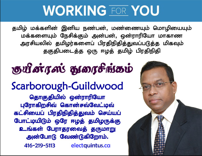 ஸ்காபரோ-கில்வூட் தொகுதியில், 2018ல் வரவுள்ள மாகாணசபைத் தேர்தலில் போட்டியிடத் தீர்மானித்துள்ள திரு.குயின்ரஸ் துரைசிங்கம் அவர்களது வேட்பாளர் நியமனத் தேர்தல் மிக விரைவில் நடக்கவிருக்கிறது. சிறந்த சமூகசேவையாளரும் அரசியல் ஆய்வாளரும் எமது சமூகத்தில் நன்கு அறியப்பட்டவருமான குயின்ரஸ் துரைசிங்கம், வடஅமெரிக்காவில் பெயர்பெற்ற முன்னணி நிறுவனமான தொம்சன்-றொய்ட்டேர்ஸ் ரொறன்ரோ கிளையில் கணினித் தொழில்நுட்பத் துறையில் கடந்த 20 வருடங்களுக்கும் மேலாக உயர் பணியிலுள்ளார்.