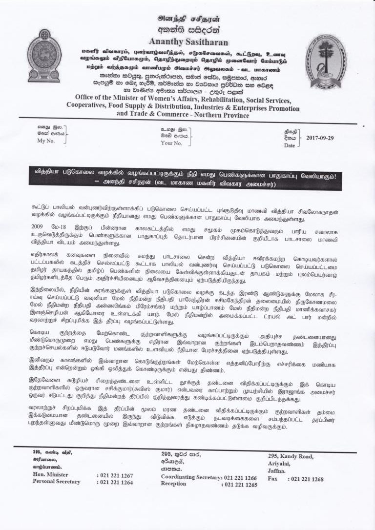 கூட்டுப் பாலியல் வன்புணர்விற்குள்ளாக்கிப் படுகொலை செய்யப்பட்ட புங்குடுதீவு மாணவி வித்தியா சிவலோகநாதன் வழக்கில் வழங்கப்பட்டிருக்கும் நீதியானது எமது பெண்களுக்கான பாதுகாப்பு வேலியாக அமைந்துள்ளது.