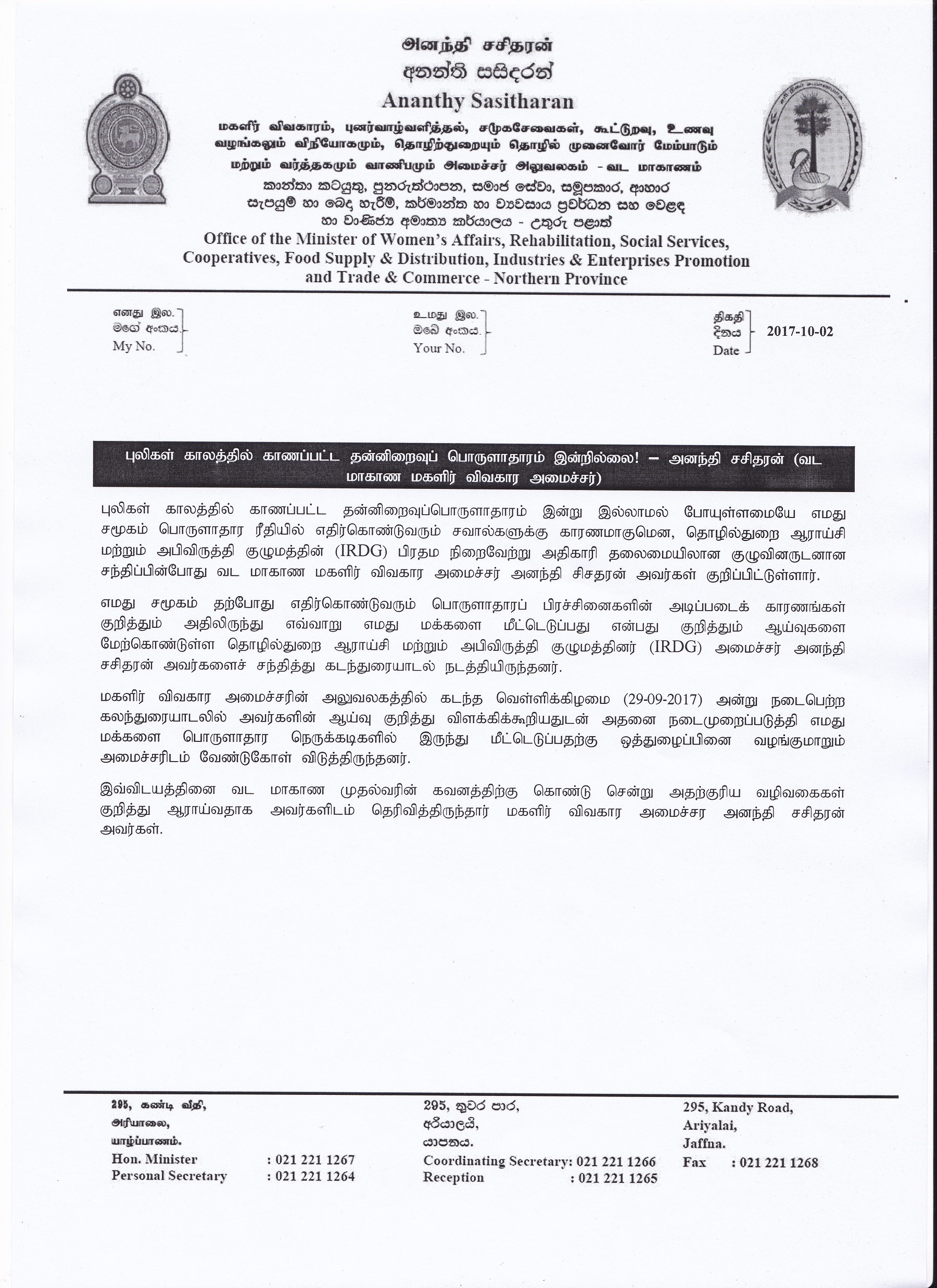 மகளிர் விவகார அமைச்சரின் அலுவலகத்தில் கடந்த வெள்ளிக்கிழமை (29-09-2017) அன்று நடைபெற்ற கலந்துரையாடலில் அவர்களின் ஆய்வு குறித்து விளக்கிக்கூறியதுடன் அதனை நடைமுறைப்படுத்தி எமது மக்களை பொருளாதார நெருக்கடிகளில் இருந்து மீட்டெடுப்பதற்கு ஒத்துழைப்பினை வழங்குமாறும் அமைச்சரிடம் வேண்டுகோள் விடுத்திருந்தனர்.