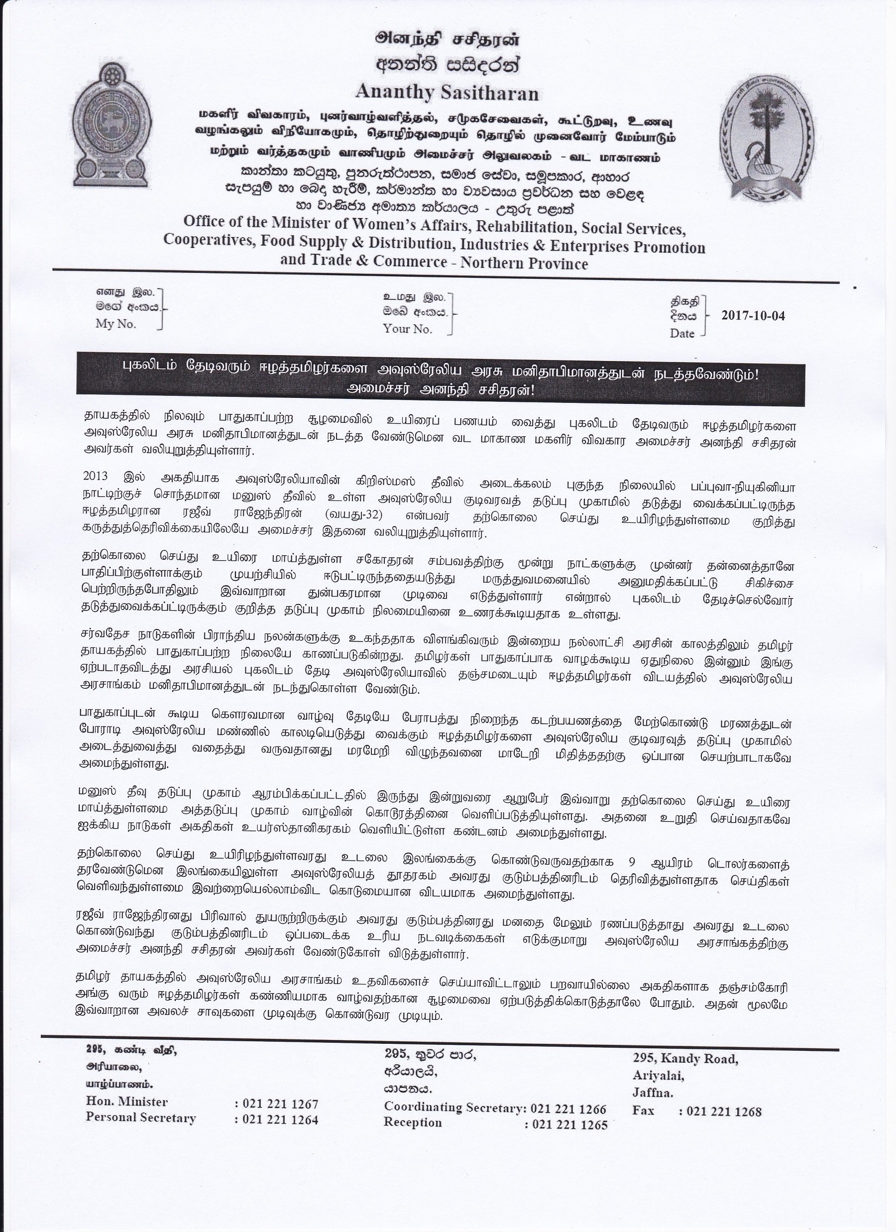 ரஜீவ் ராஜேந்திரனது பிரிவால் துயருற்றிருக்கும் அவரது குடும்பத்தினரது மனதை மேலும் ரணப்படுத்தாது அவரது உடலை கொண்டுவந்து குடும்பத்தினரிடம் ஒப்படைக்க உரிய நடவடிக்கைகள் எடுக்குமாறு அவுஸ்ரேலிய அரசாங்கத்திற்கு அமைச்சர் அனந்தி சசிதரன் அவர்கள் வேண்டுகோள் விடுத்துள்ளார்.