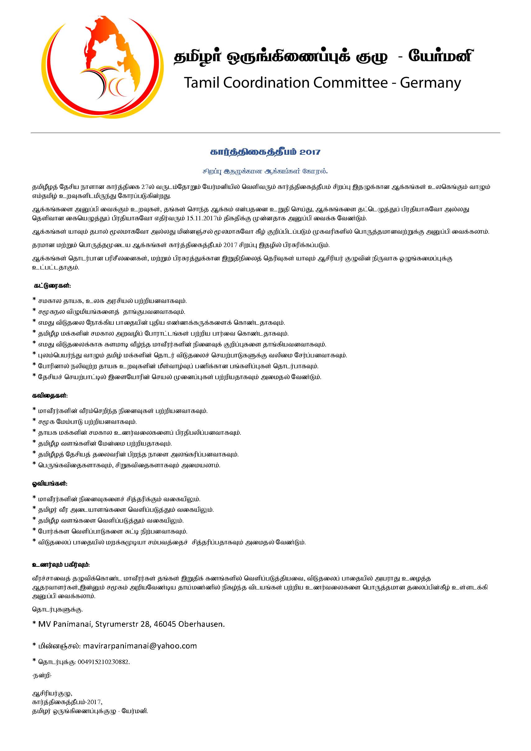 தமிழீழத் தேசிய நாளான கார்த்திகை 27ல் வருடம்தோறும் யேர்மனியில் வெளிவரும் கார்த்திகைத்தீபம் சிறப்பு இதழுக்கான ஆக்கங்கள் உலகெங்கும் வாழும் எம்தமிழ் உறவுகளிடமிருந்து கோரப்படுகின்றது.
