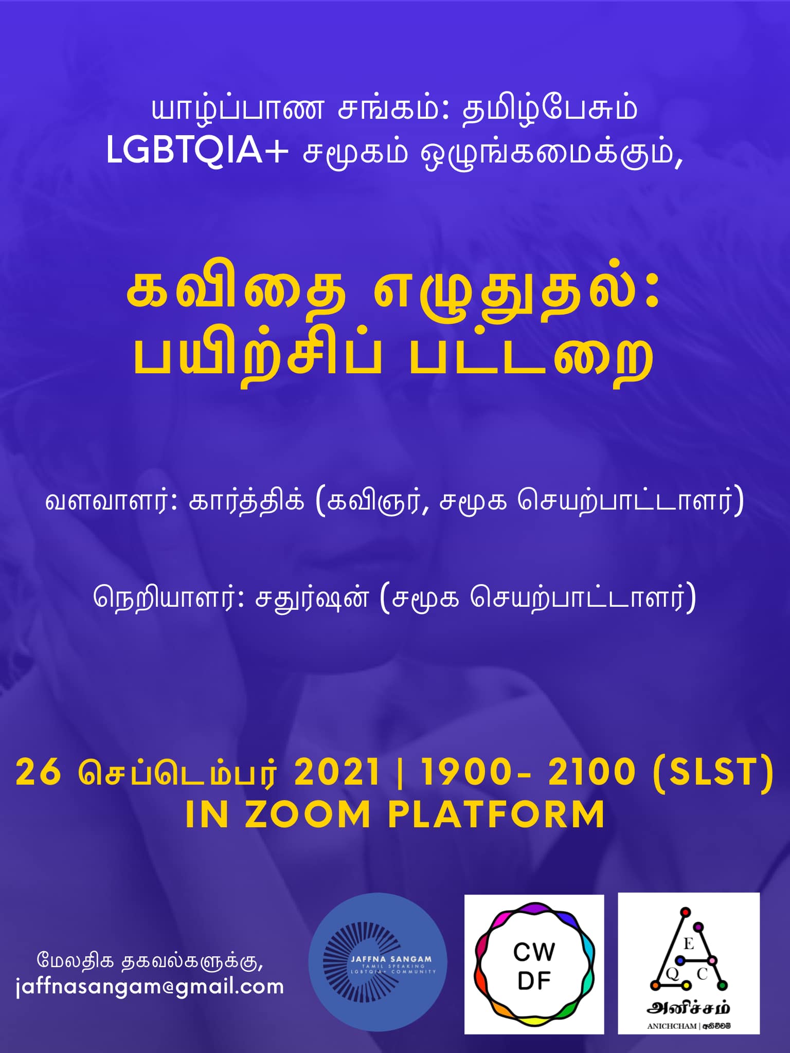 ‘கவிதை எழுதுதல்: பயிற்சிப் பட்டறை Posted by தென்னவள் - September 8, 2021 வளவாளர்: கார்த்திக் (கவிஞர், சமூக செயற்பாட்டாளர்) தற்போது குயர் கலை இலக்கிய வடிவங்களின் வளர்ச்சி நிகழ்நிலை கலைத் துறையில் முக்கியமானதொன்றாக…