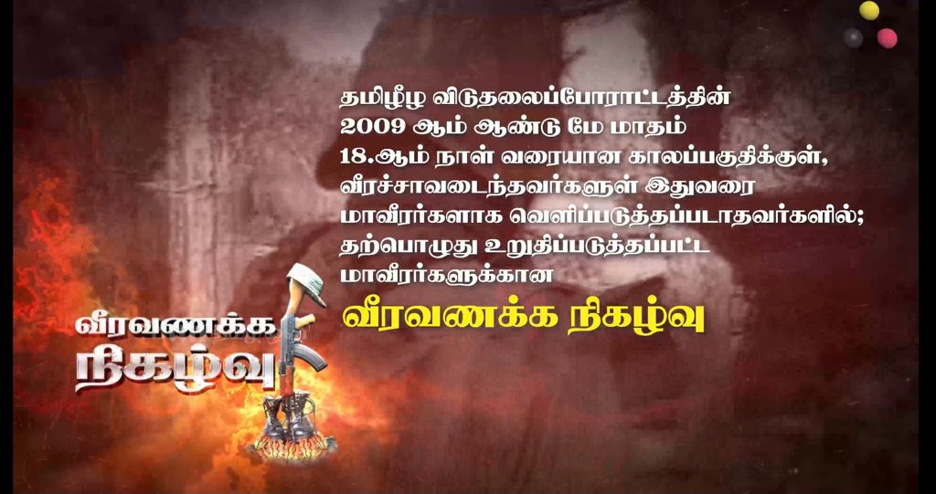 வீரவணக்க நிகழ்வு 12.09.2021 Posted by கவிரதன் - September 8, 2021 தமிழீழ விடுதலைப் போராட்டத்தின் 2009 ஆம் ஆண்டு மே மாதம் 18 ஆம் நாள் வரையான காலப்பகுதிக்குள், வீரச்சாவடைந்தவர்களுள் இதுவரை…