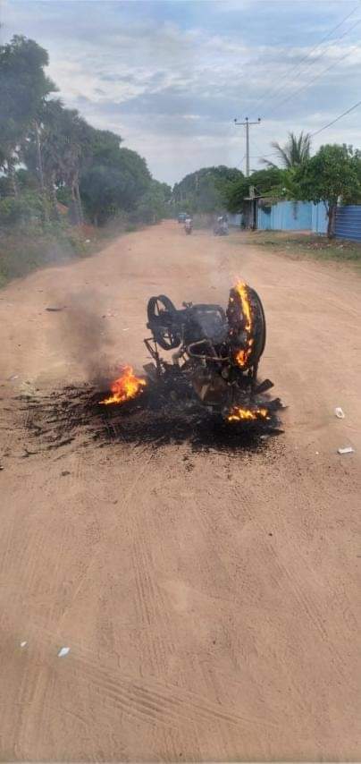 கிளிநொச்சி புளியம்பொக்கணை பகுதியில் கடந்த சனிக்கிழமை இரவு இனந்தெரியாதோரால் நிறுத்திவைக்கப்பட்டிருந்த மோட்டார் சைக்கிள் ஒன்று அடித்து நொறுக்கப்பட்டு தீக்கிரையாக்கப்பட்டுள்ளது.